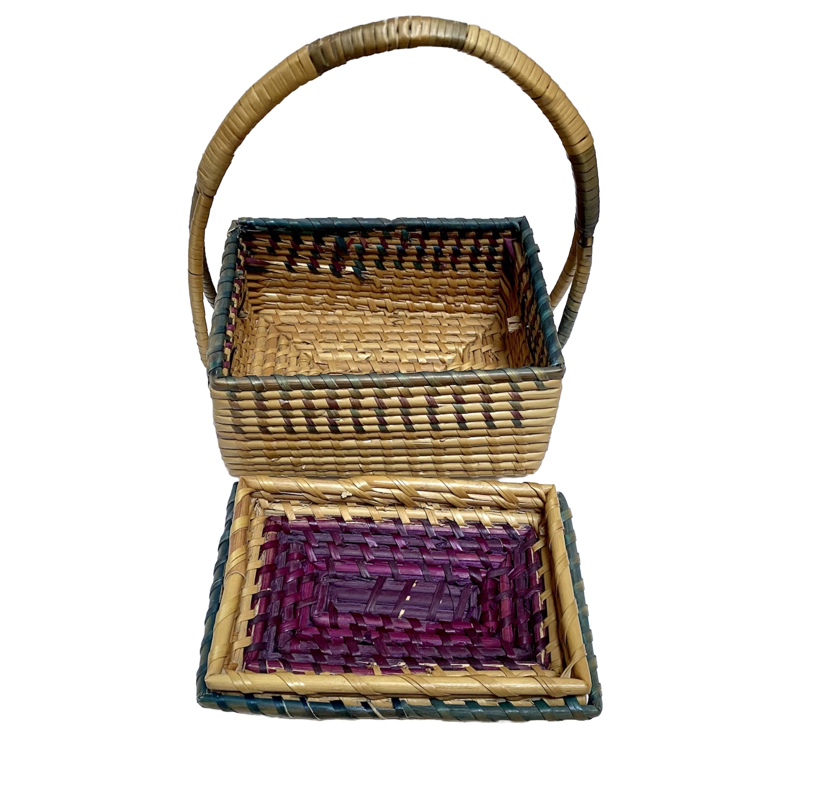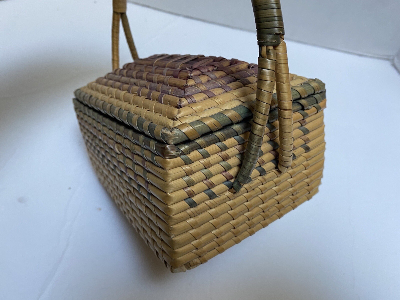 Handwoven Small Coiled Straw Rectangle Basket w/Lid Handle Trinket Rustic Boho