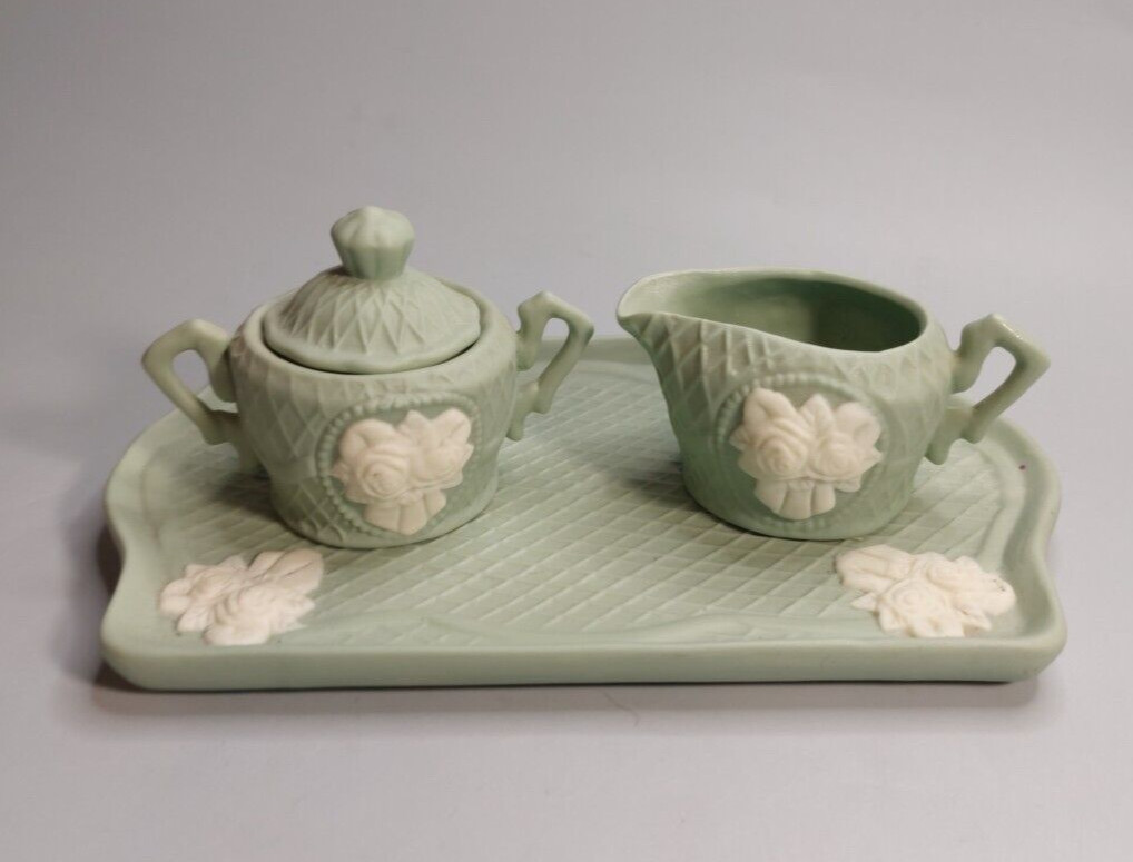 Rose Tea Set 6 Piece Minature Bisque Porcelian Green/Ivory
