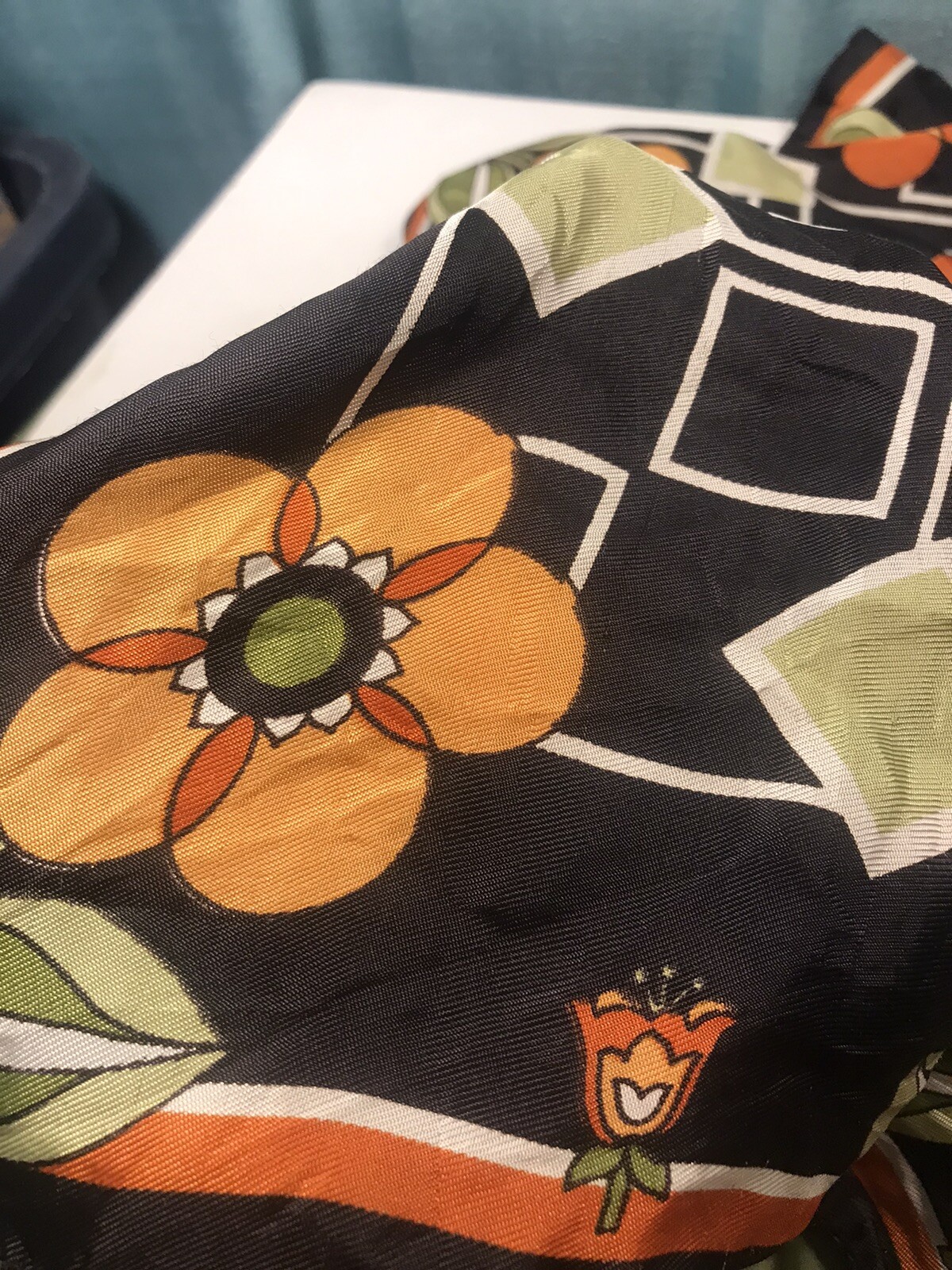 как выглядит Vintage Orange Black Yellow Hand Rolled Floral 30 Square Scarf Japan Satin фото