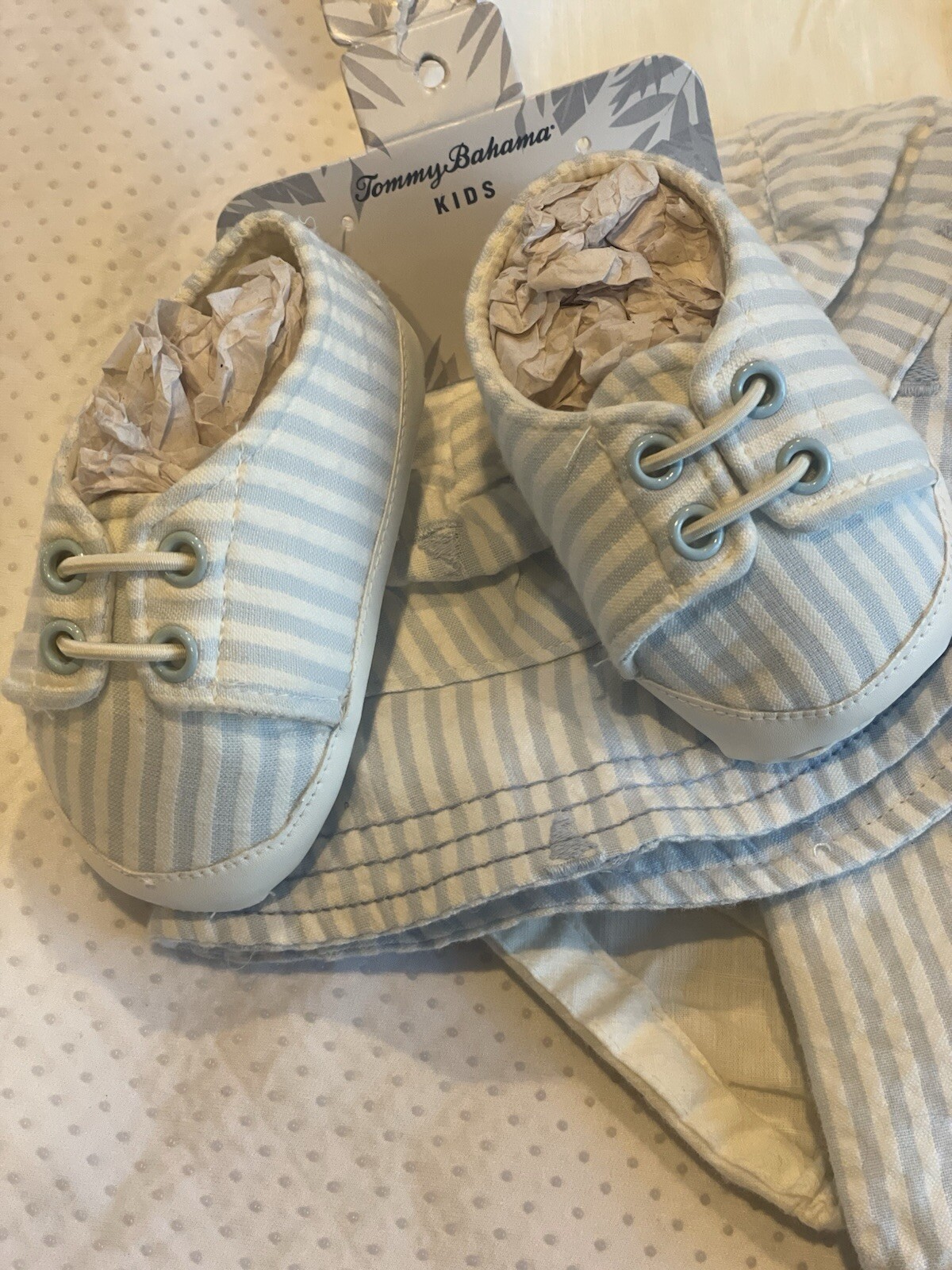 как выглядит TOMMY BAHAMA KIDS 6-9mo 3pc ensemble: Snap SS Shirt Shorts Hat Crib Shoes NWT фото