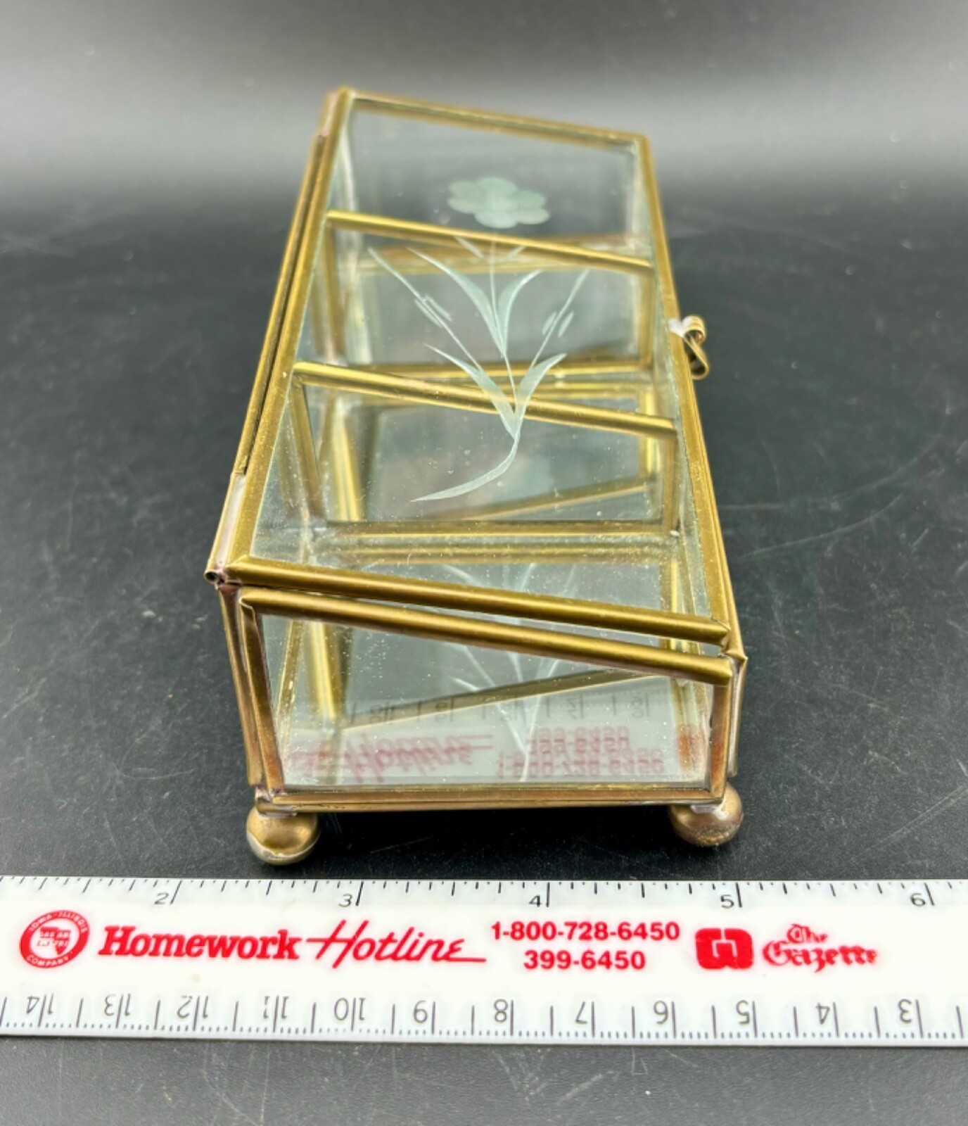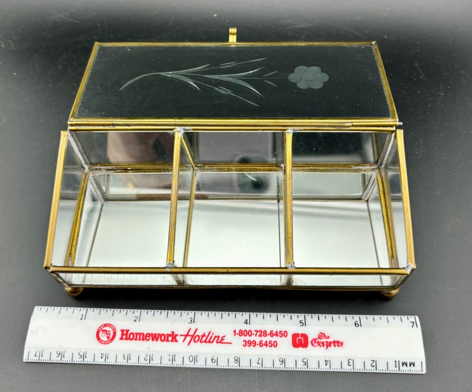 Vintage Brass And Etched Glass Divided Trinket Box Jewelry Flower 6.25 x 2.5