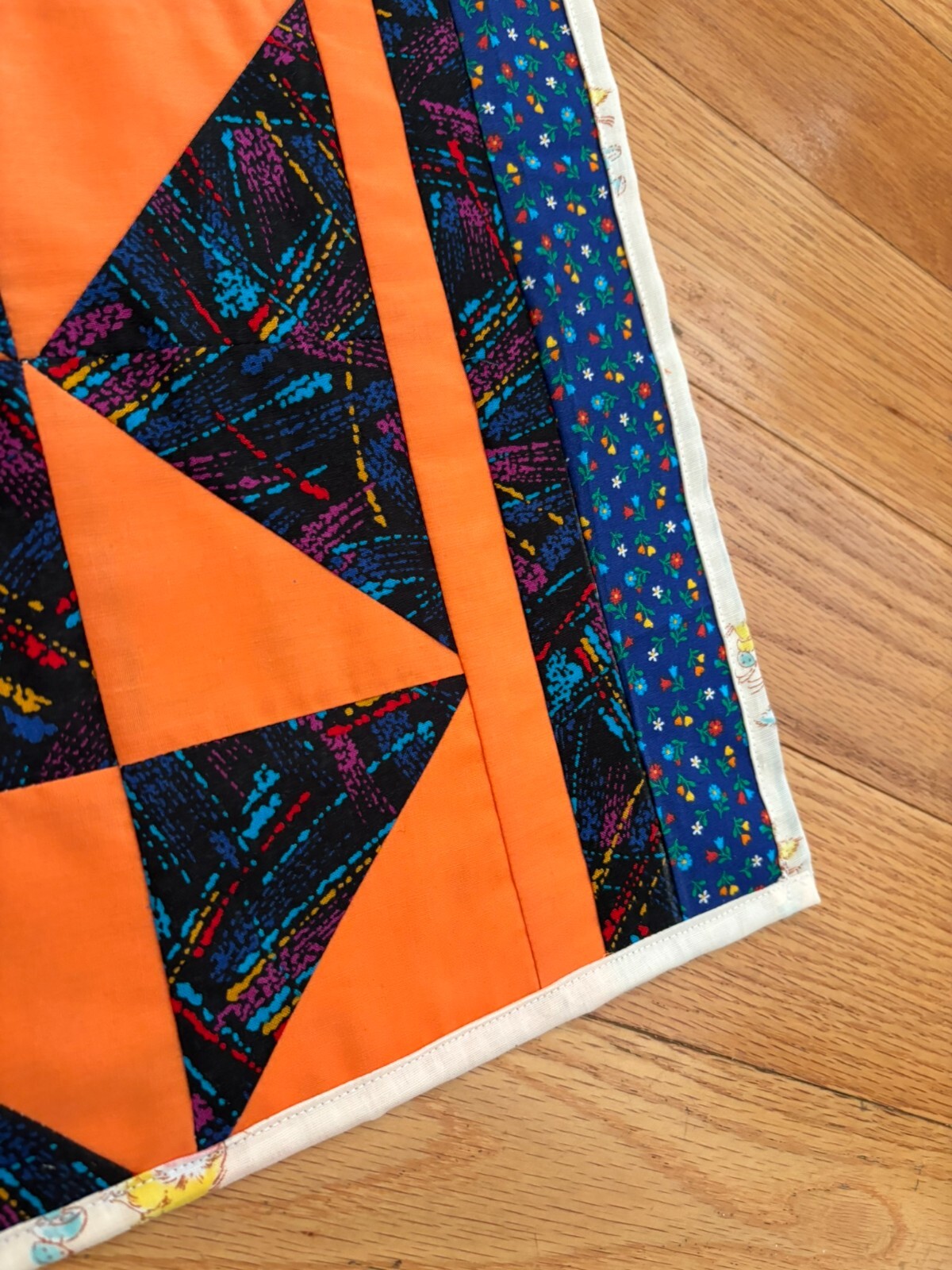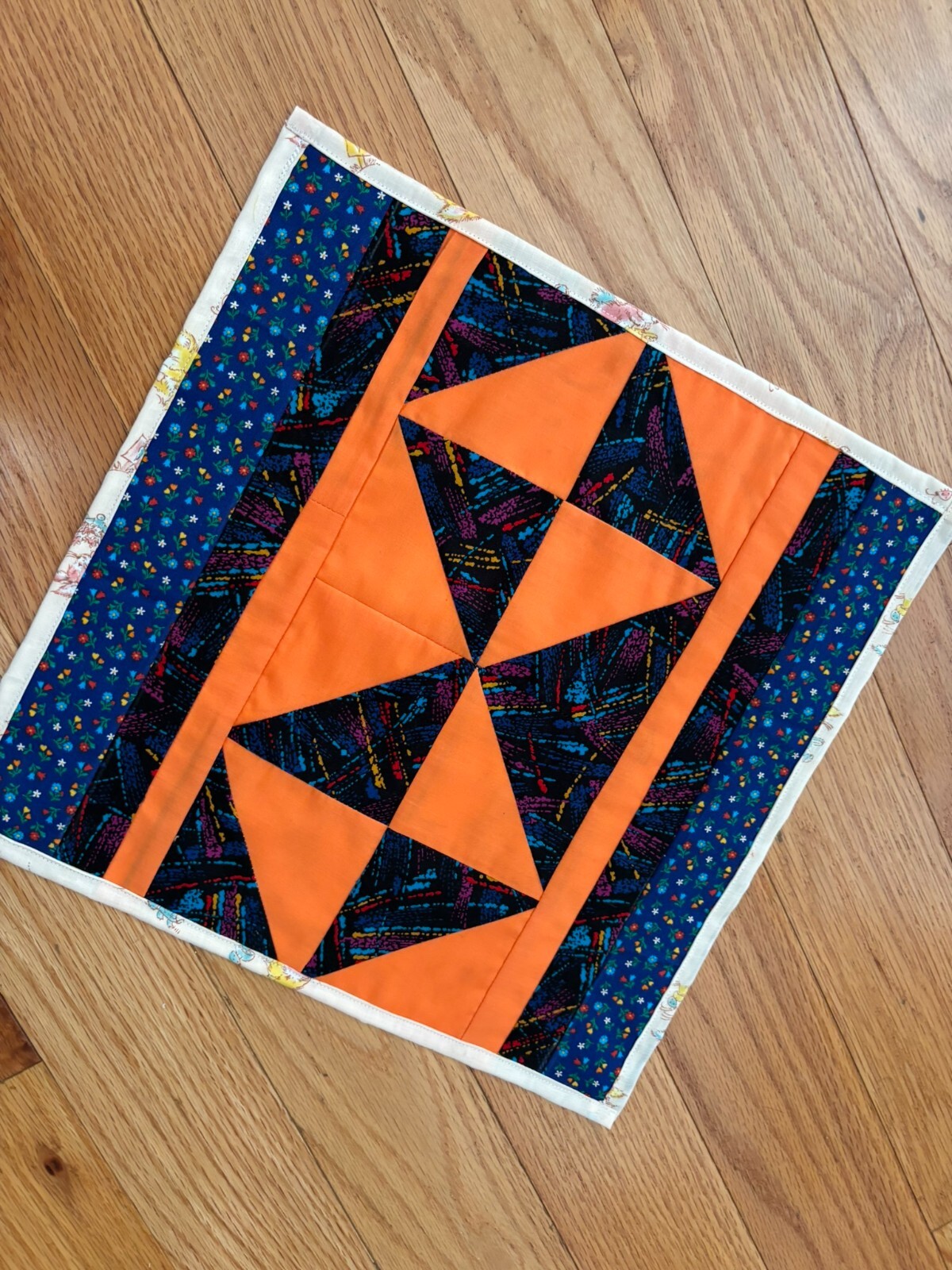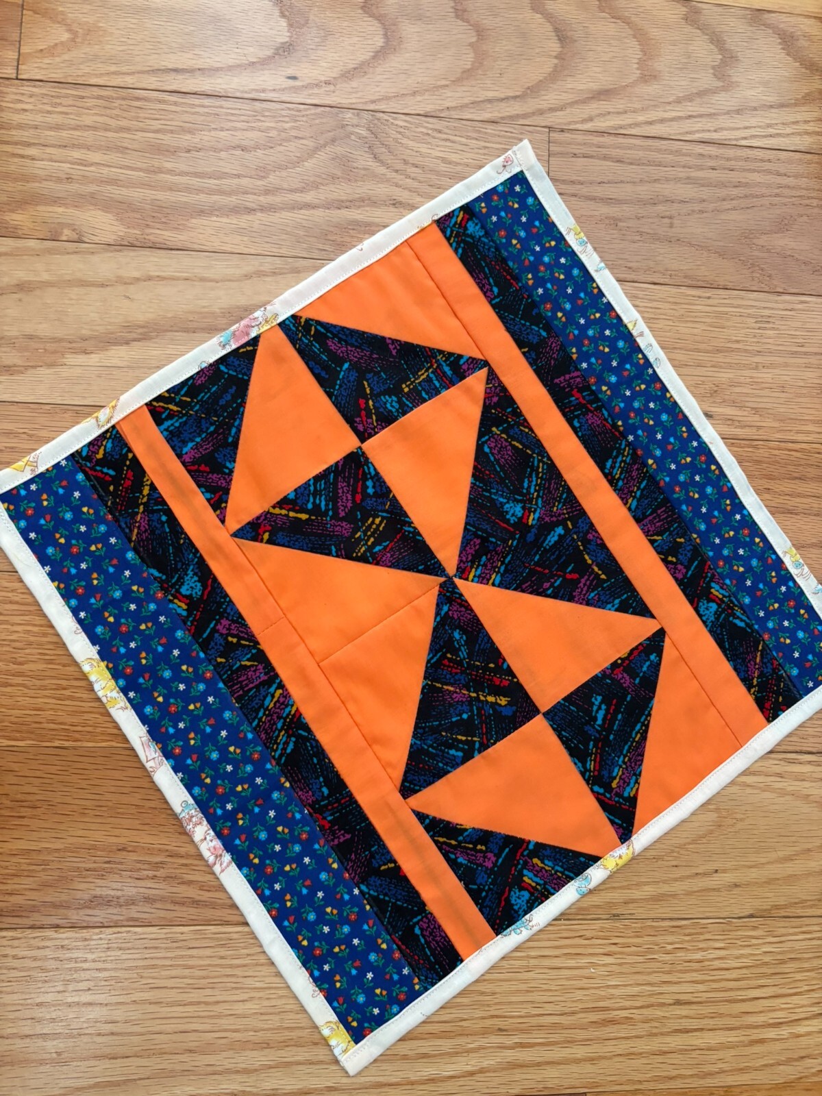 Quilted table topper , new handmade, 13x 13 patched orange and dark blue