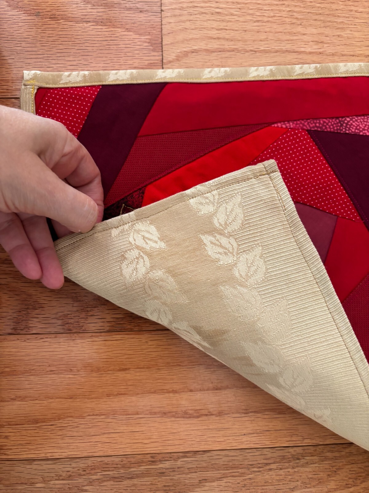 как выглядит Quilted Table Topper red as a flower 12 x 12.5, goldish liner on the back, new фото