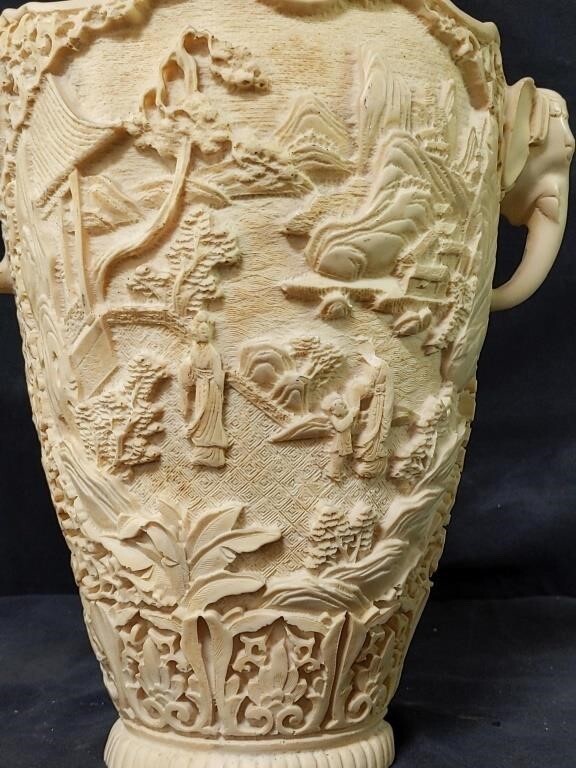 • Vintage Asian Vase Carved Resin Stone Scenic Elephant Handles Wood Base 10.5