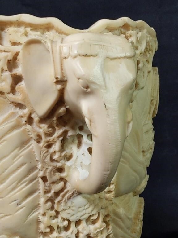 как выглядит Vintage Asian Vase Carved Resin Stone Scenic Elephant Handles Wood Base 10.5 фото
