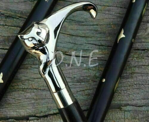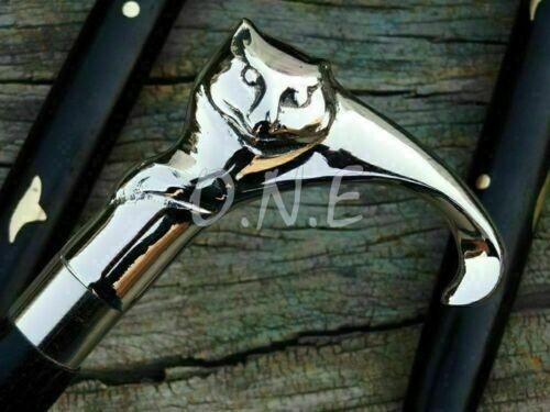 Brass Nickle Finish Cat Handmade Handle Vintage Wooden Walking Stick Cane Gift