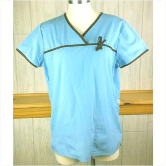 Sky Blue Ribbon Ringer Scrunch Scrub Top Women's S Short Sleeve Cherokee