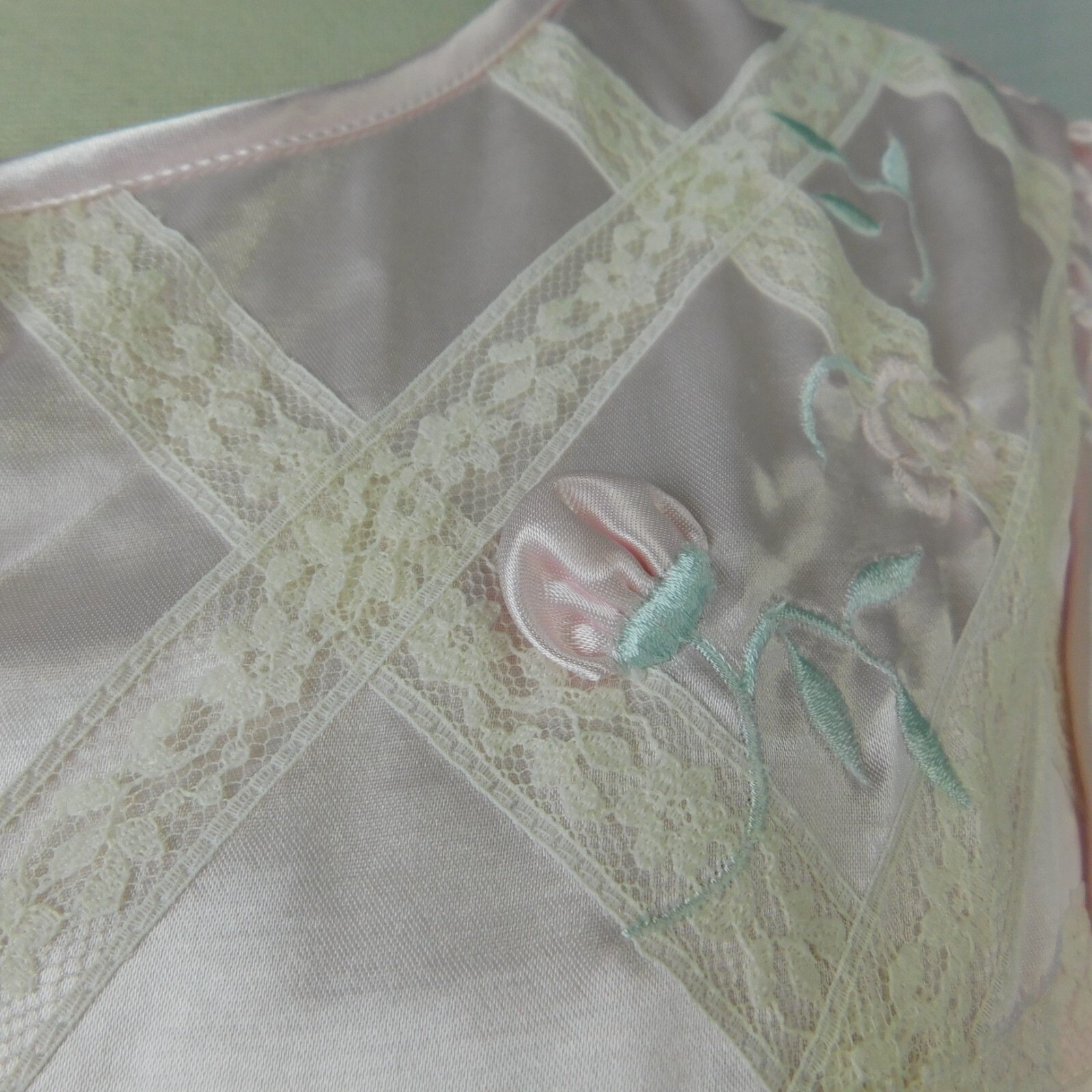 Vintage Erika Taylor Lace Trim Embroidered Satin Nightgown - Pink, Medium 9664