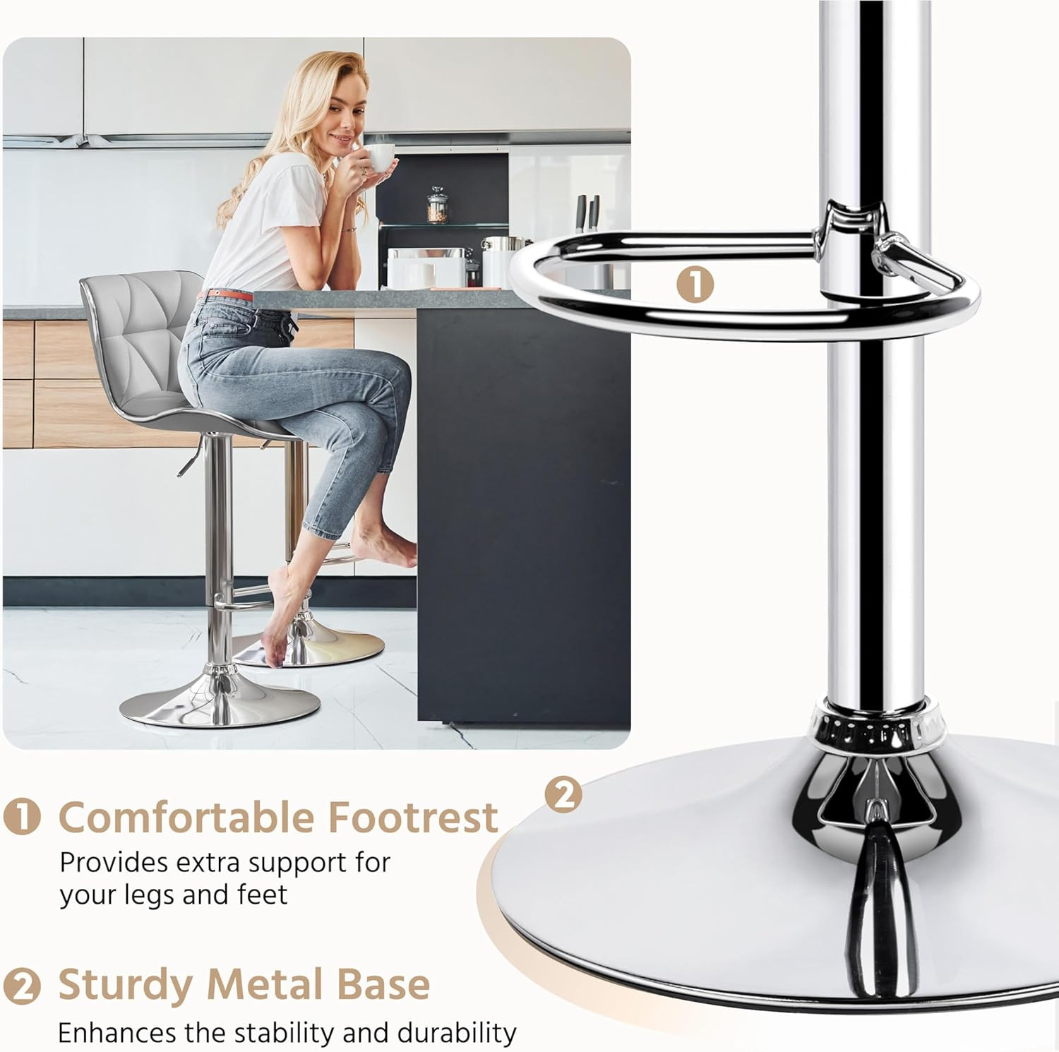 Bar Stools Set of 2, PU Leather Swivel Adjustable Barstools with Shell Back, Bar
