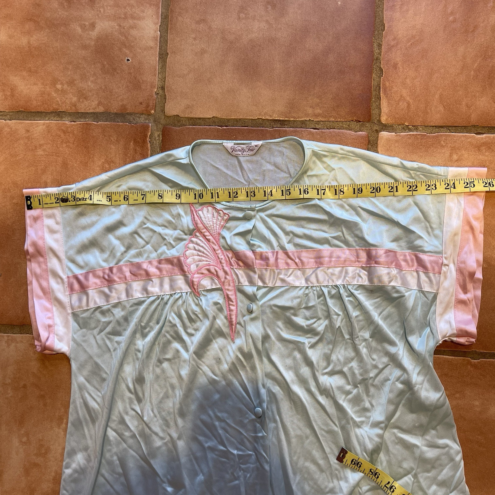 Vanity Fair Nylon Satin PJ Button Front Blue Peach Appliqued 1960s Womens Medium