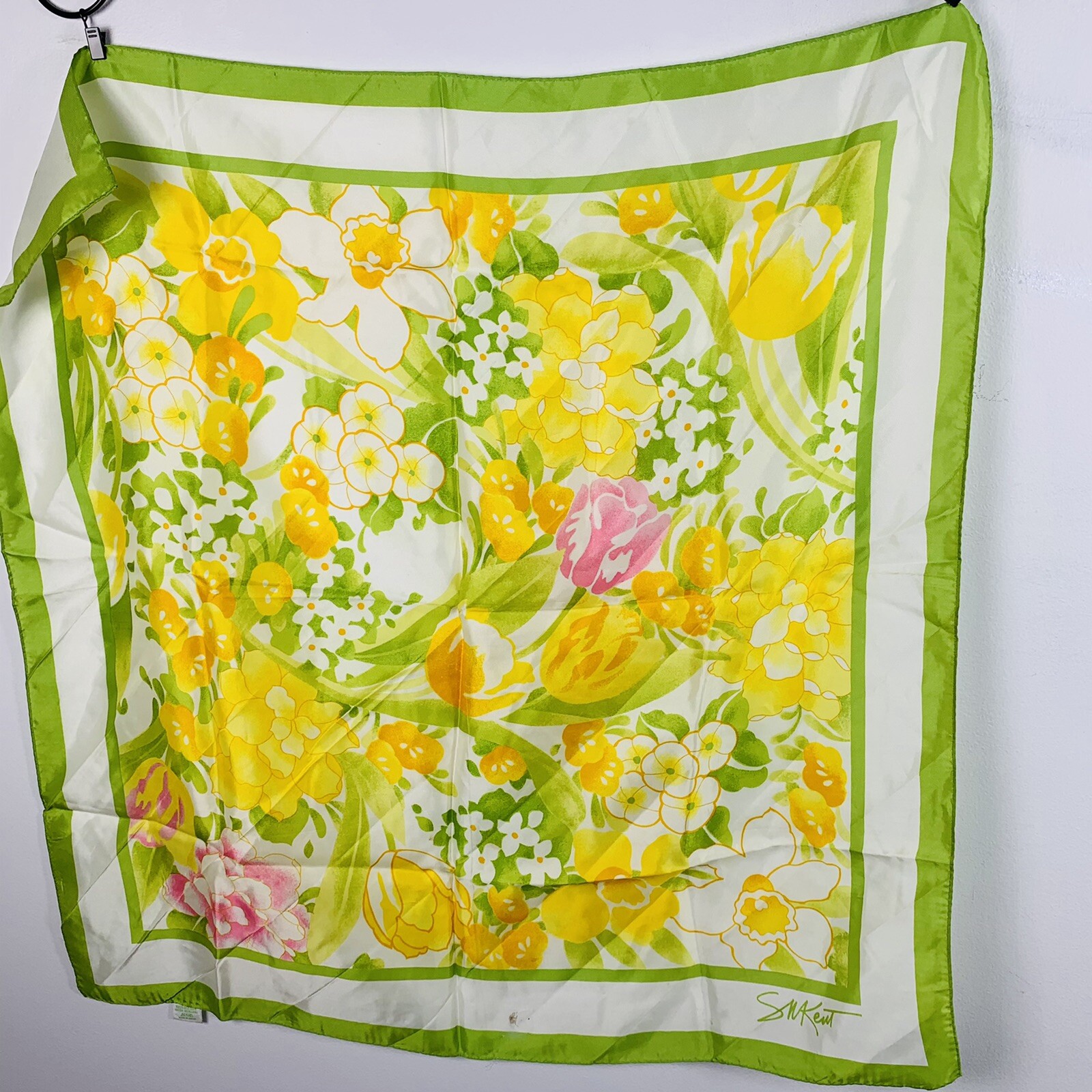 как выглядит S M Kent Square Scarf Lime Green Yellow Floral Geometric VINTAGE фото