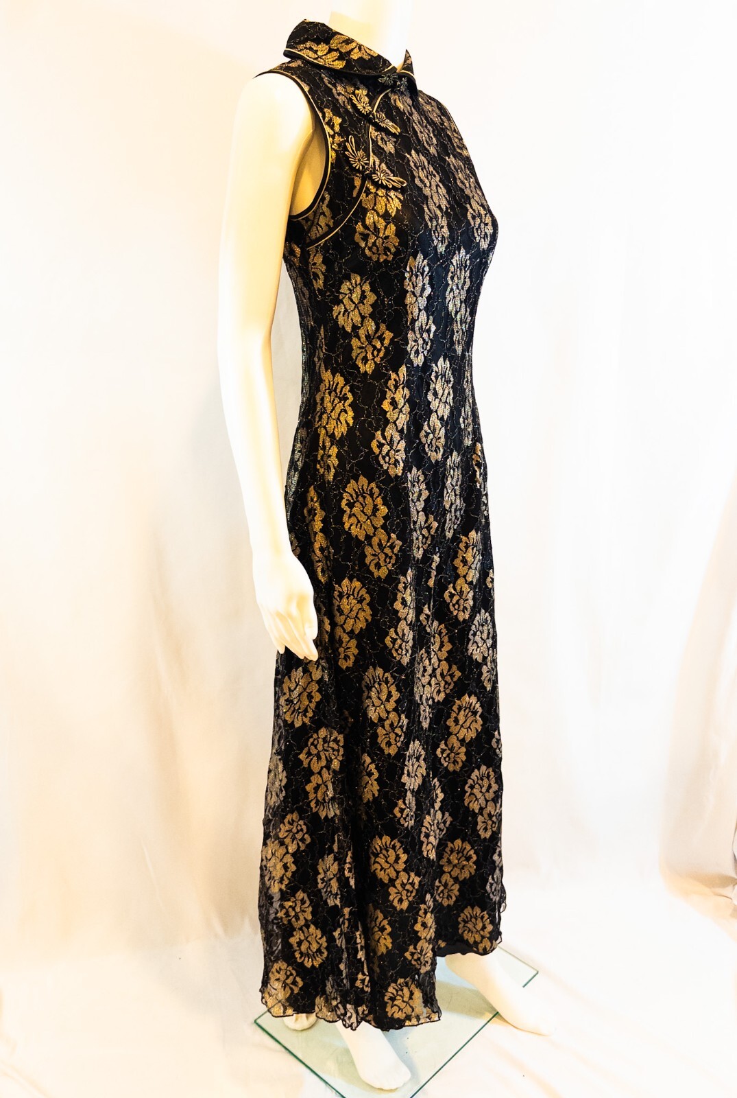 Maxi Cheongsam Mandarin Chinese Vintage Black and Gold Lace Dress