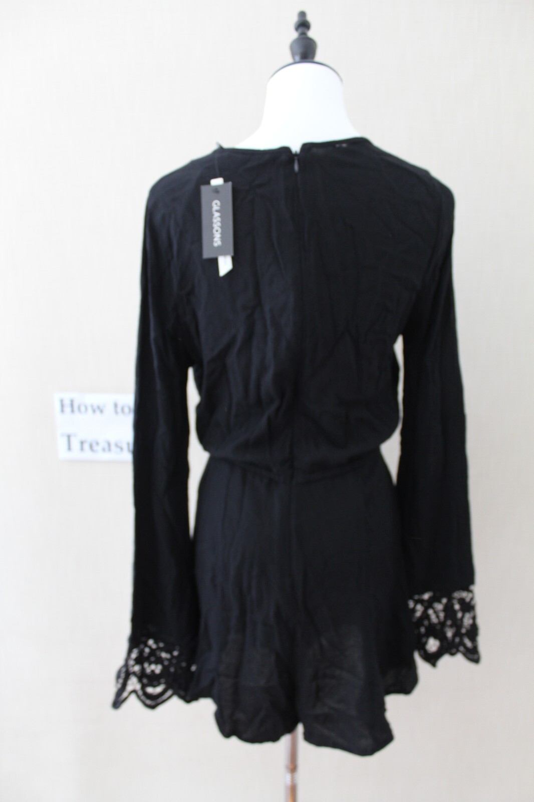 как выглядит QT 16 BNWT SIZE 10 GLASSONS BLACK LONG BRODERIE ANGLAISE SLEEVE SHORTS PLAYSUIT фото