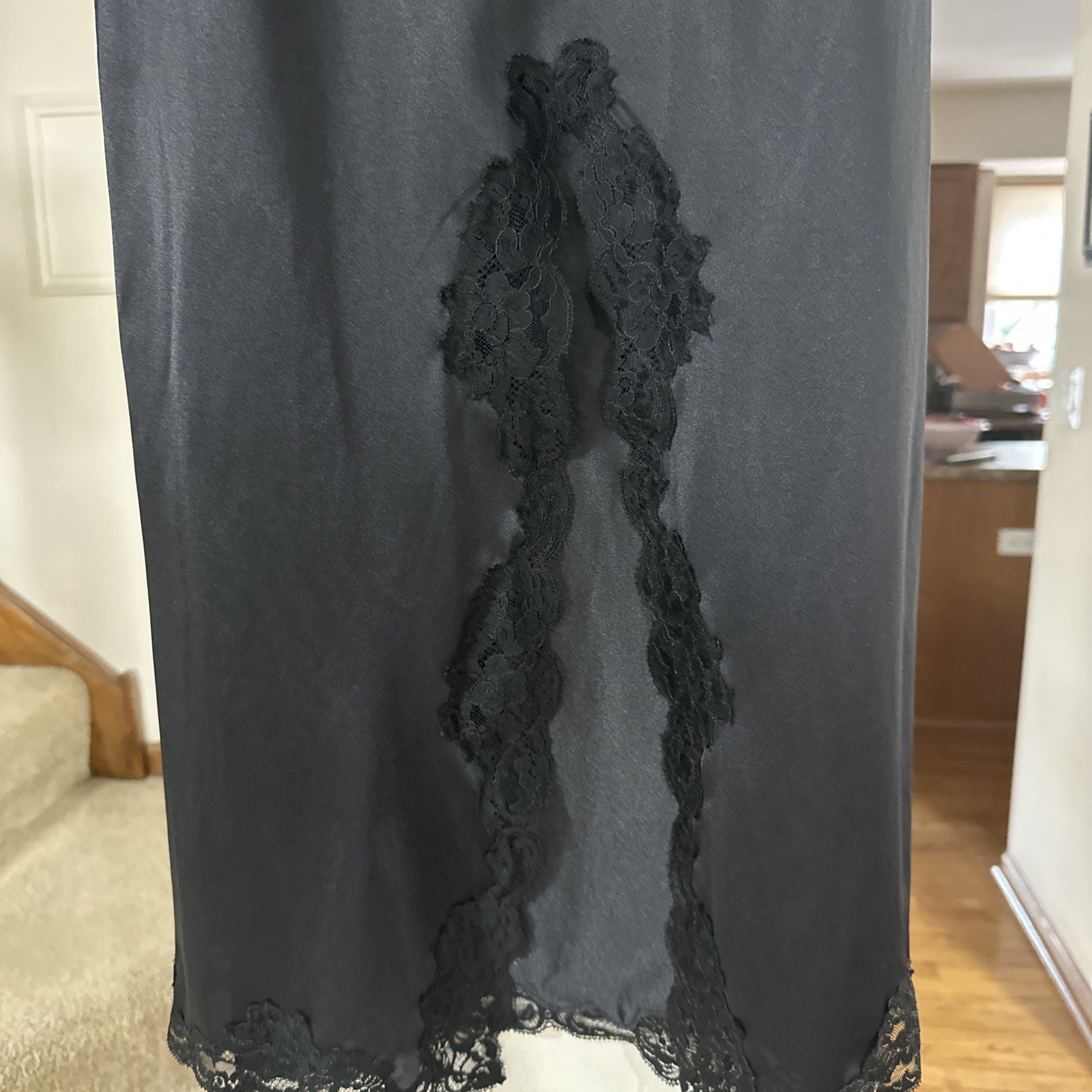 как выглядит Vintage Wonder Maid Long Half Slip Skirt Lace Trim Black Front Slit Non Cling S фото