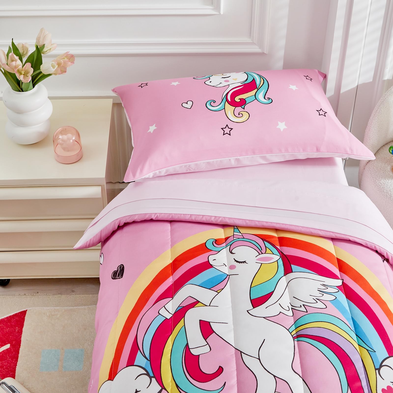 4 Pieces Toddler Bedding Set for Girls Pink Unicorn Toddler Bed Set - Cartoon...
