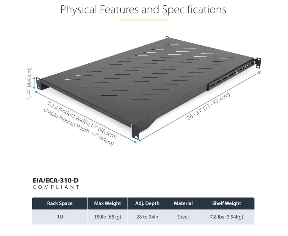 StarTech 1U Adjustable Mounting Depth Vented Rack Mount Shelf - 150 Lbs