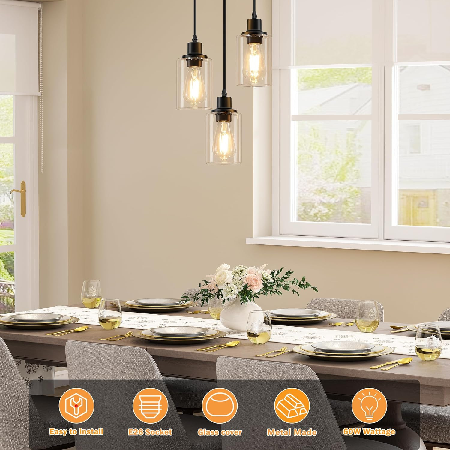3-Light Pendant Light Fixtures, Black Pendant Lights Kitchen Island, Adjustable