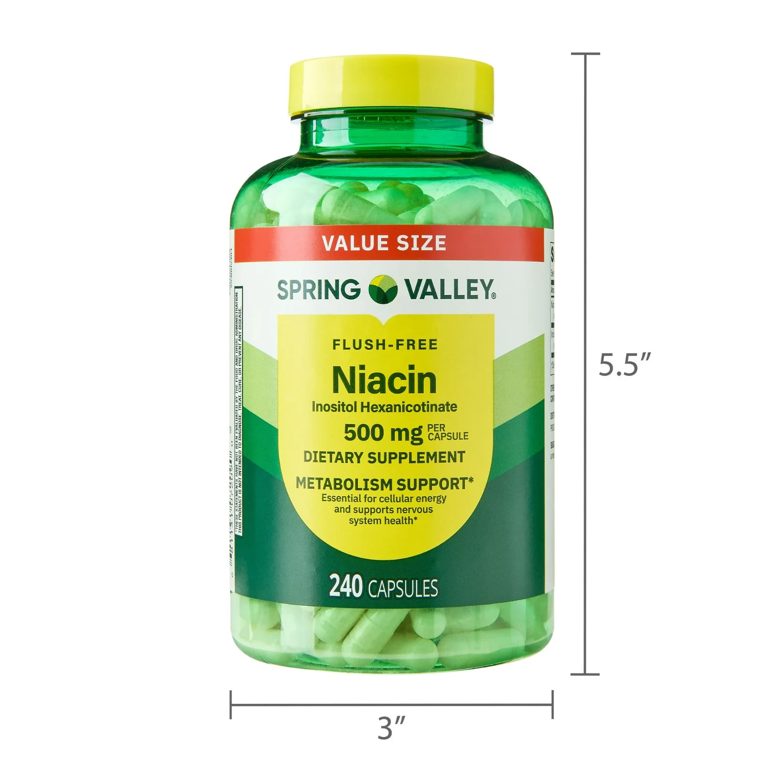 Spring Valley Flush Free Niacin 500 mg Capsules, Dietary Supplement, 240 Count