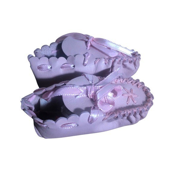 как выглядит Vintage pink handmade leather baby moccasins with vintage card фото