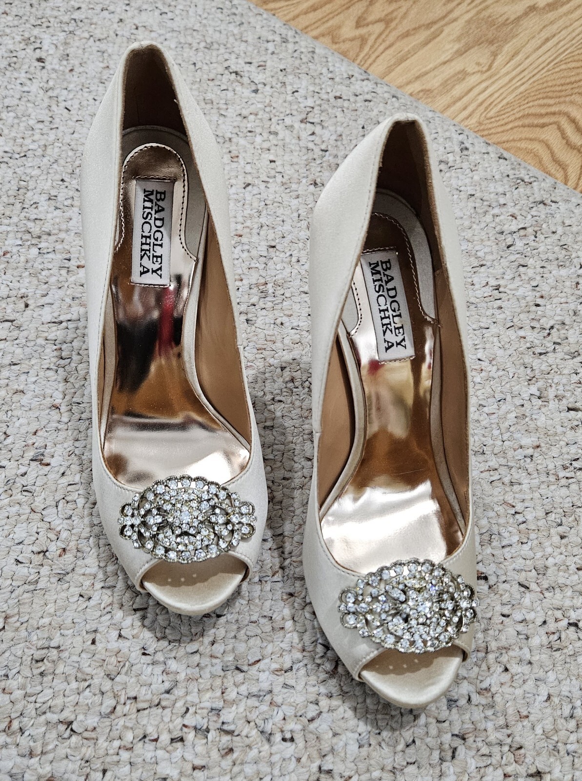 Badgley Mischka dressy formal bridal 4.5 heel peep-toe Ivory Satin Rhinestone
