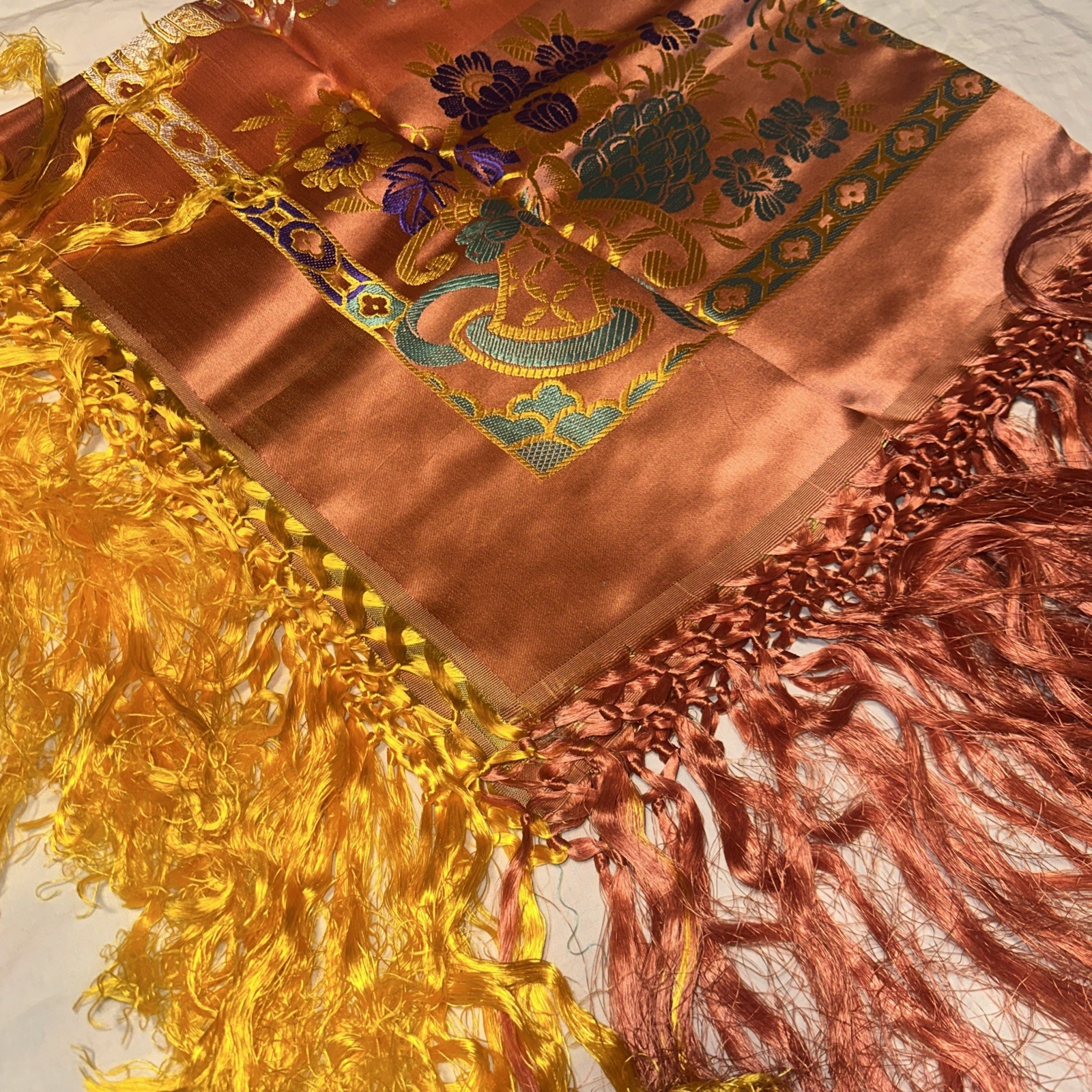 Vintage Floral Silk Satin Brocade Fringe Shawl Piano Scarf Tablecloth 1