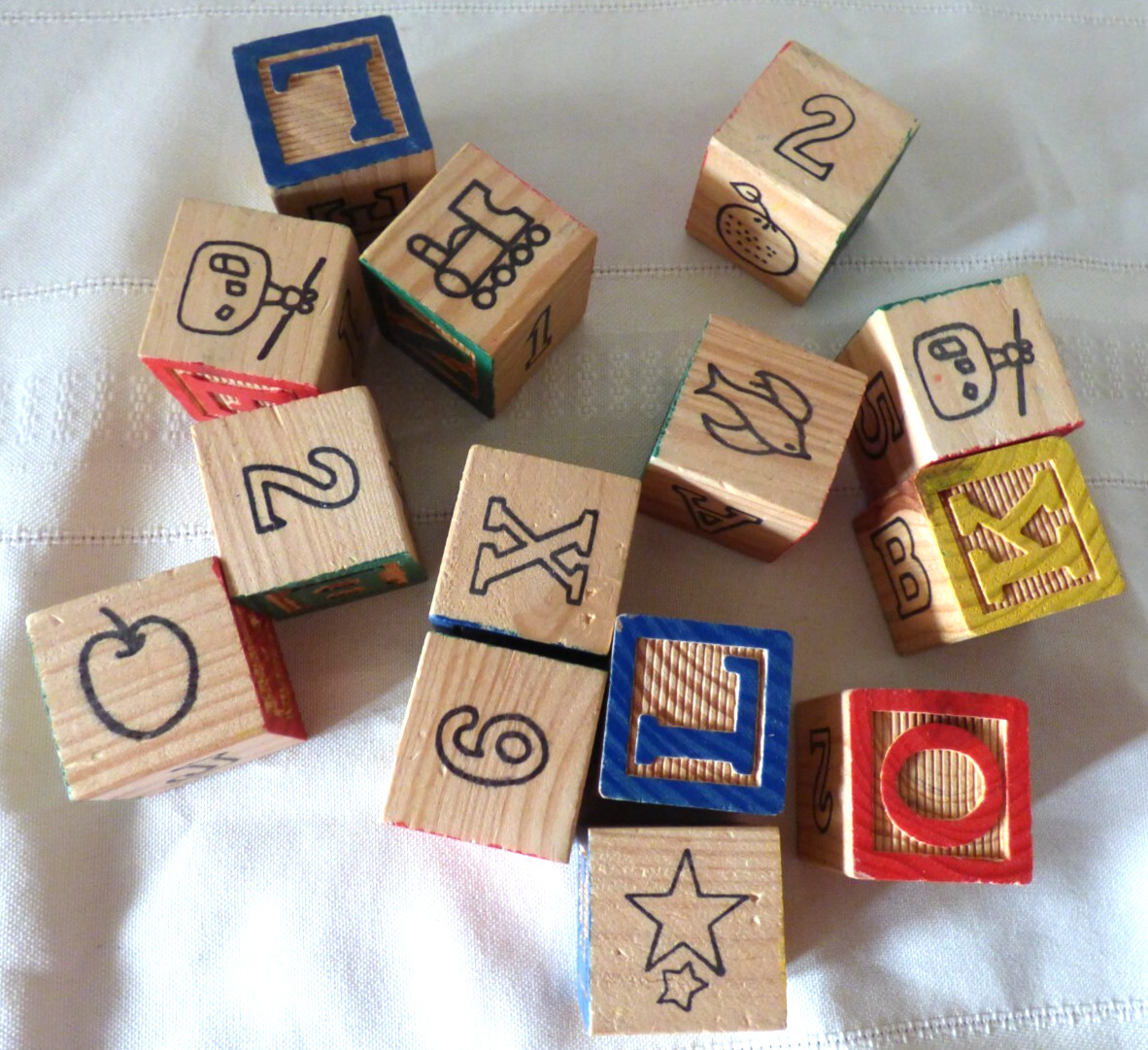 Lot of 14 Vintage Wooden Alphabet Picture Blocks Mixed Colors, 1 1/8 Square