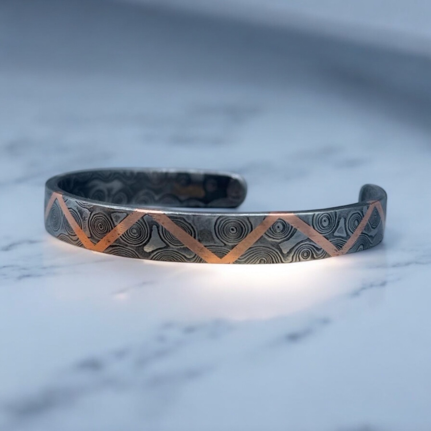 Damascus Steel Bracelet with Copper Lining Hand Forged Viking Modern Jewelry