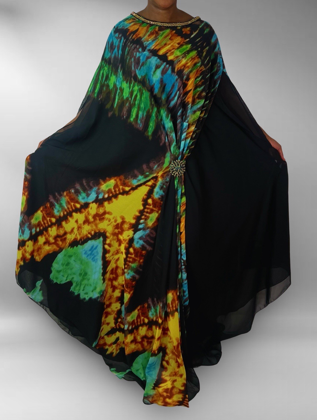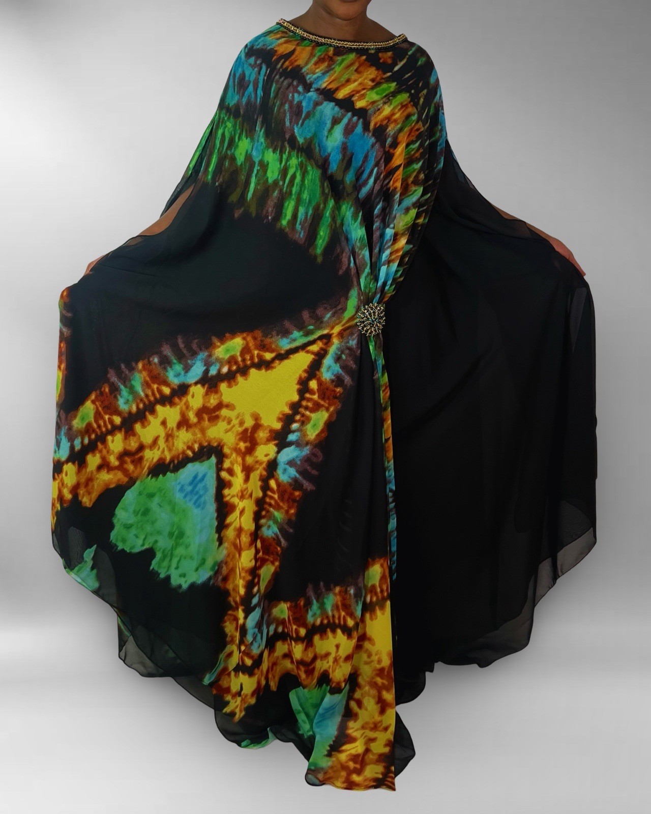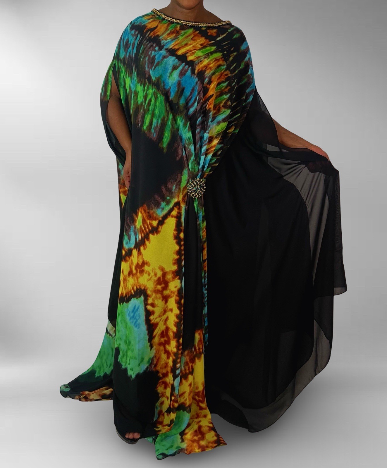 Black Multicolor Sheer Chiffon Embellished Print Oversized Maxi Kaftan Dress