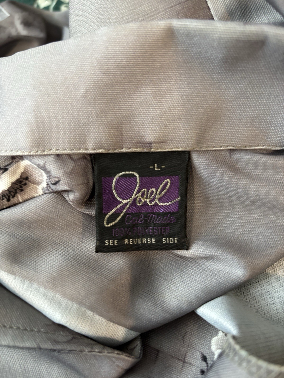 как выглядит Vintage Joel Cal Made Men s Shirt Large Polyester Gray Silver Floral 70s 80s фото
