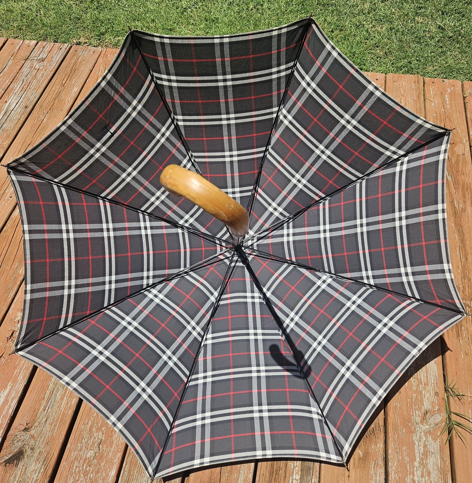 Vtg Unisex Burberry Walking Umbrella Gray Nova check Plaid Wood J Handle