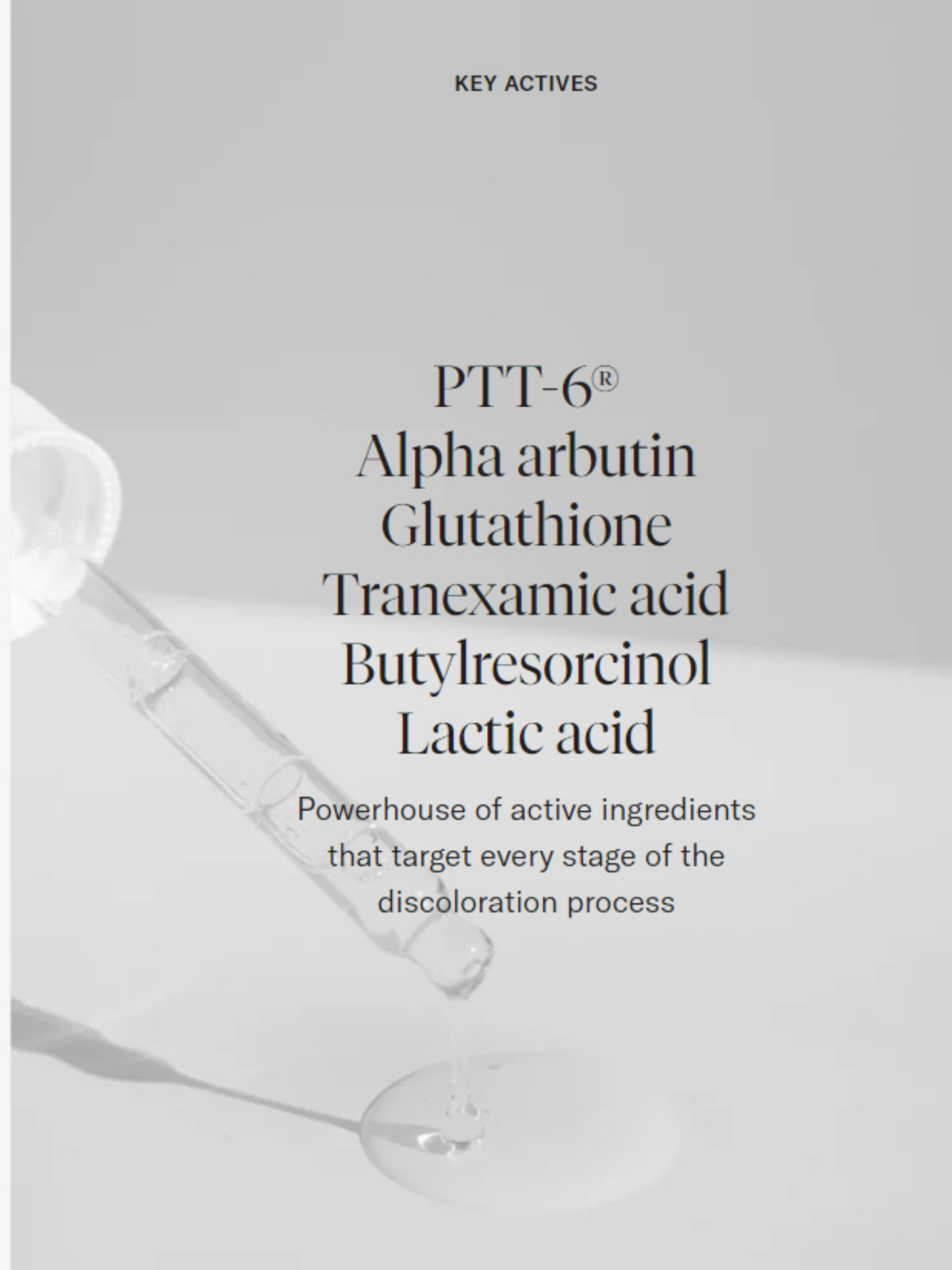 Ingredients: PTT-6®, 4- Butylresorcinol, Niacinamide, Arbutin, Tranexamic Acid