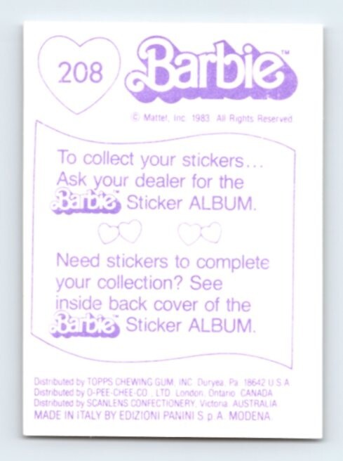 • Vintage 1983 PANINI FASHION BARBIE 208 ALBUM STICKER 1 Sheet Mattel SD66