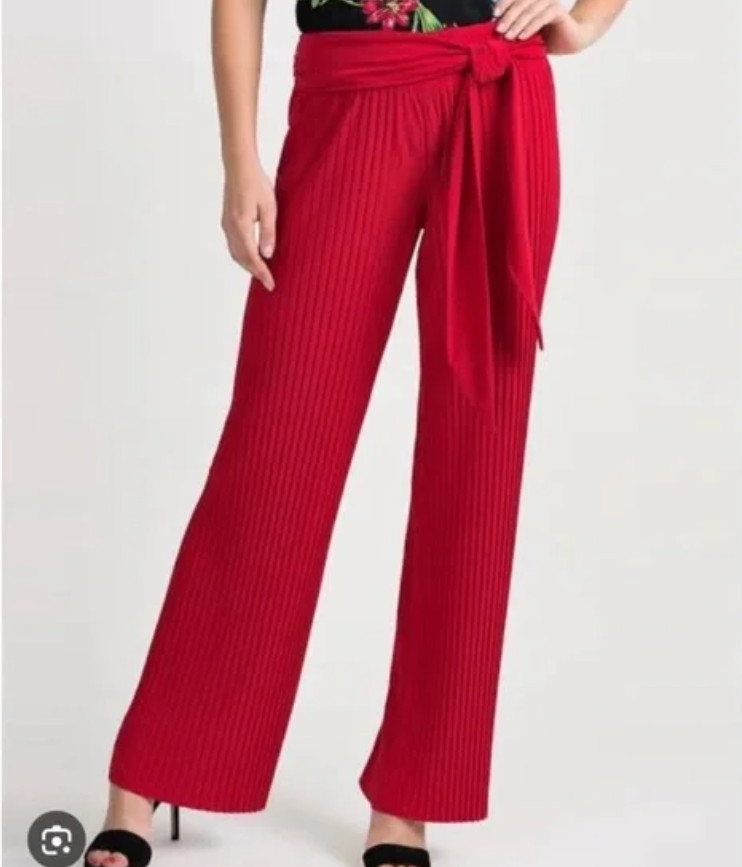 как выглядит JOSEPH RIBKOFF Lipstick Red Pleated Wide Leg Pants Stretch Tie Waist Pull on 6 фото