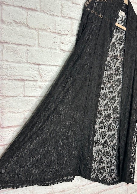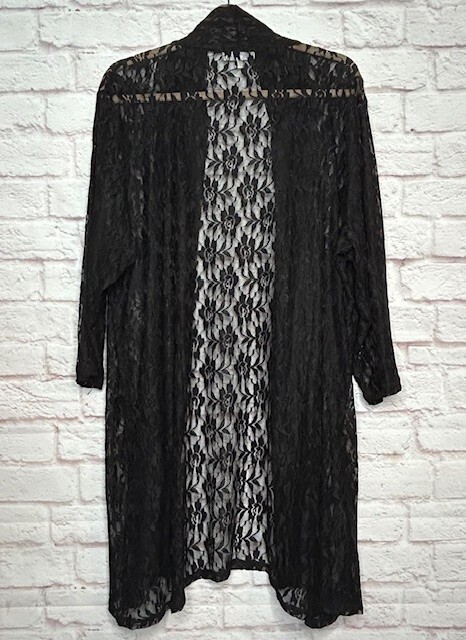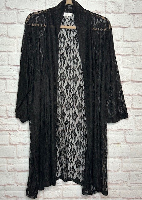 XL/1X/2X/3X New Jet Black Floral Stretchy Lace Long Duster Cardigan Kimono