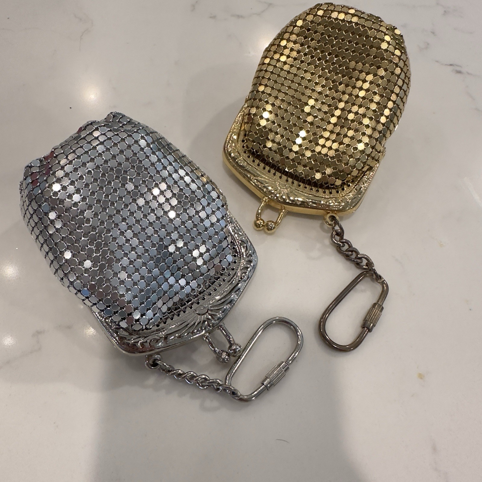 Vintage 80s Mesh Gold Silver Tone Coin Purse Kiss Clasp Satin Pouch Retro Pair