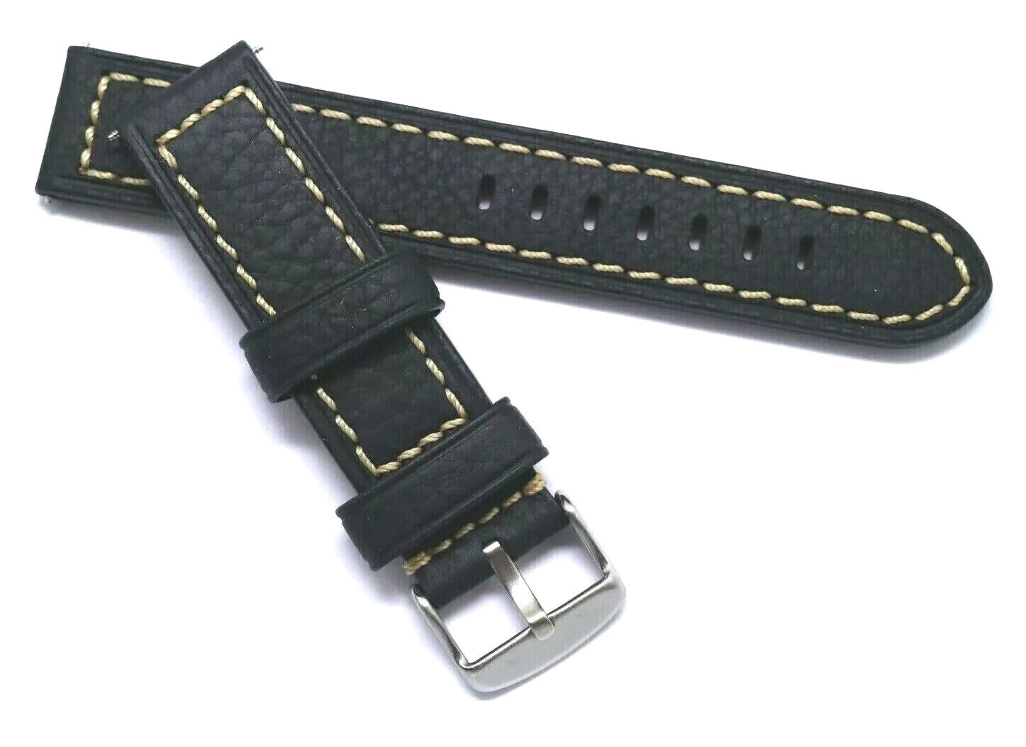 20mm Black Oily Cowhide Leather Contrast Stitch Watch Band W/ Silver Tone Buckle