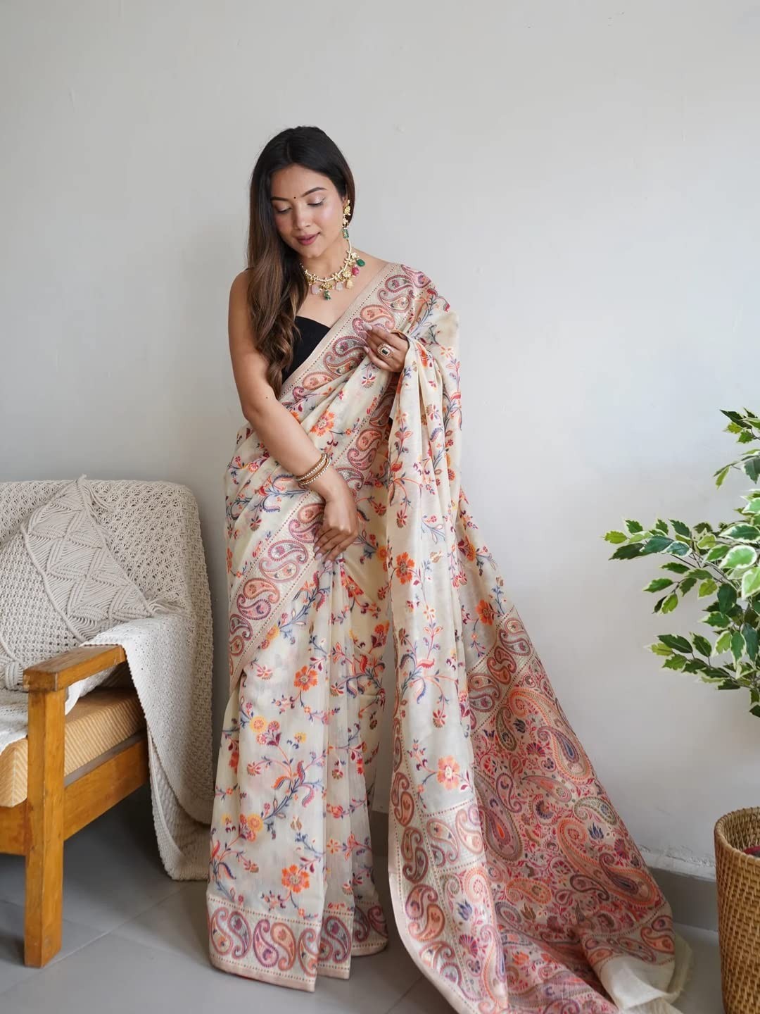 Women's Kashmiri Pashmina Jamawar Woven Banarasi Silk Saree With Blouse Piec