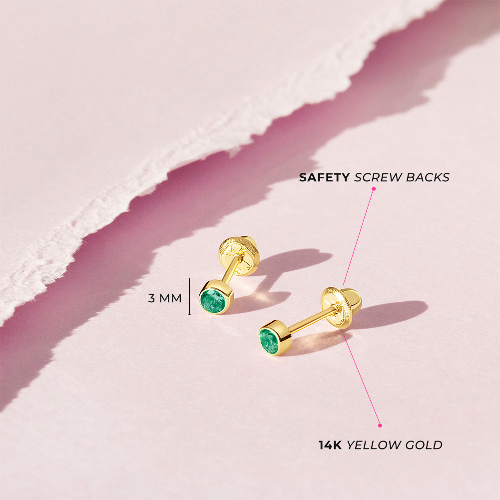 14k Yellow Gold 3mm Bezel Simulated Birthstone CZ Screw Backs Earrings Babies