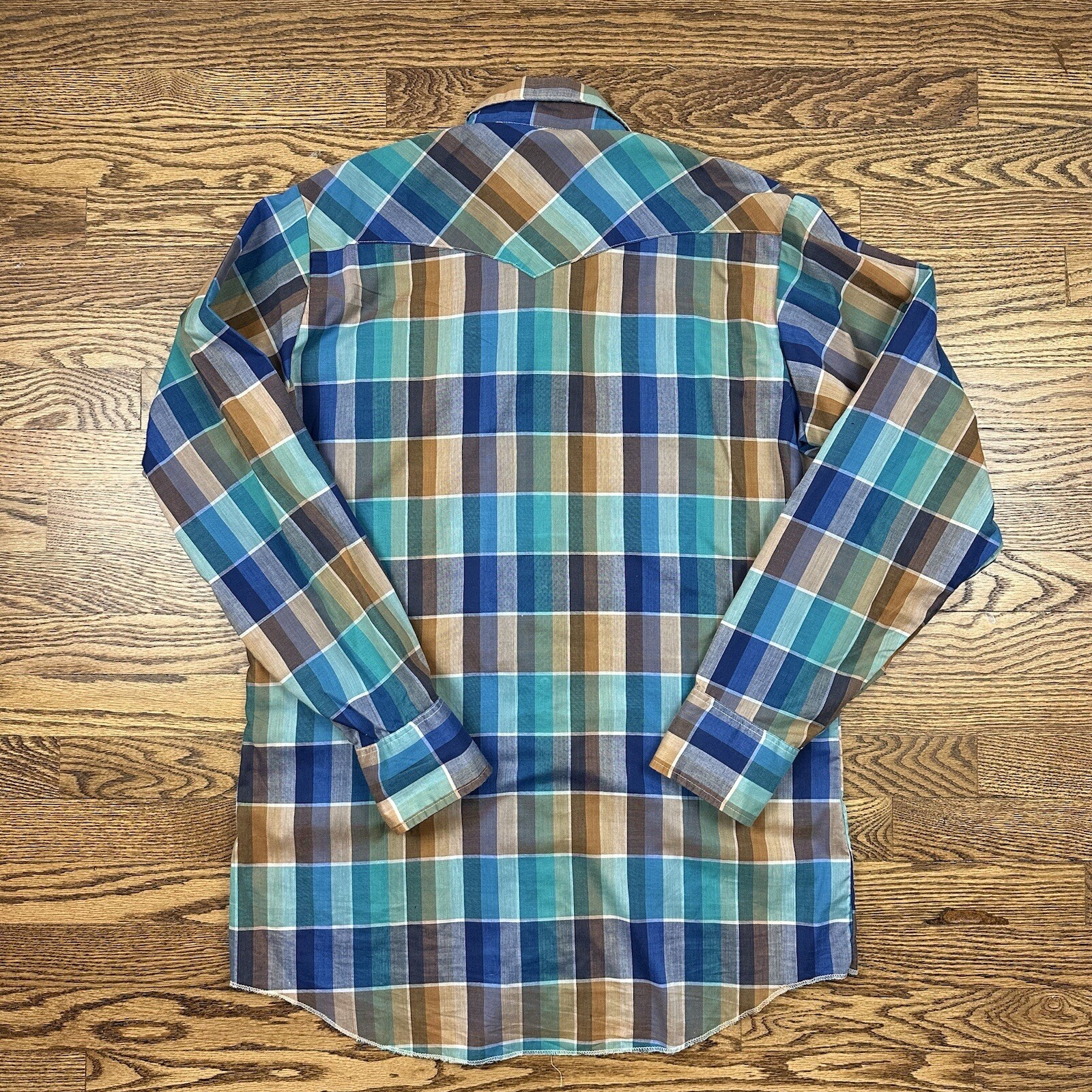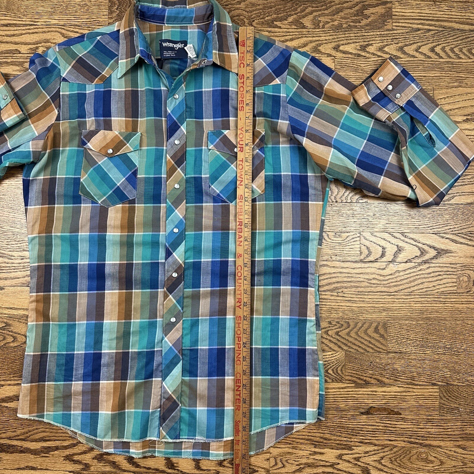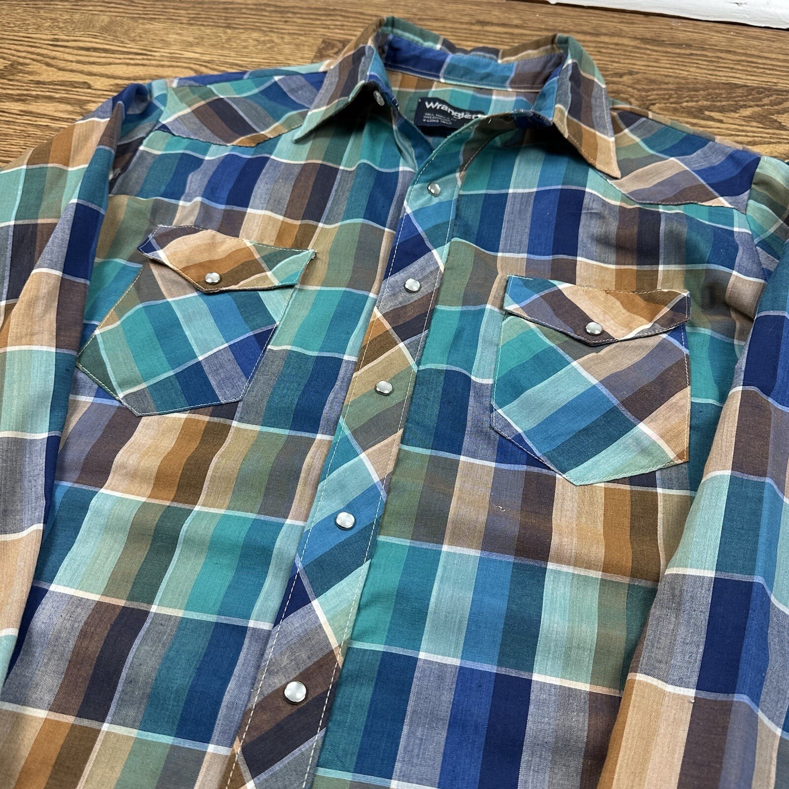 VTG 80s Wrangler Pearl Snap Western Aztec Plaid Shirt X-Long Tails Size Large