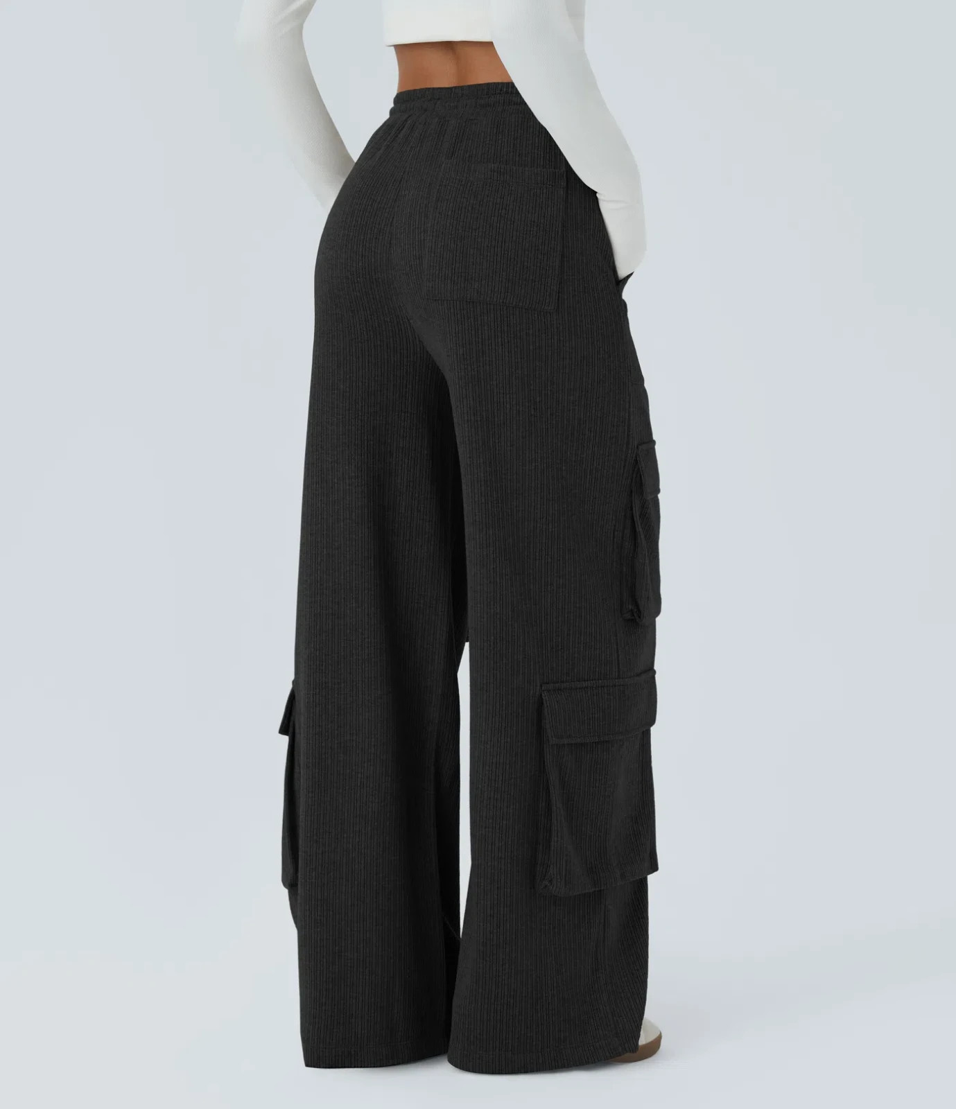 как выглядит Halara Ribbed Mid Rise Drawstring Pockets Wide Leg Cargo Casual Pants- Black-M фото