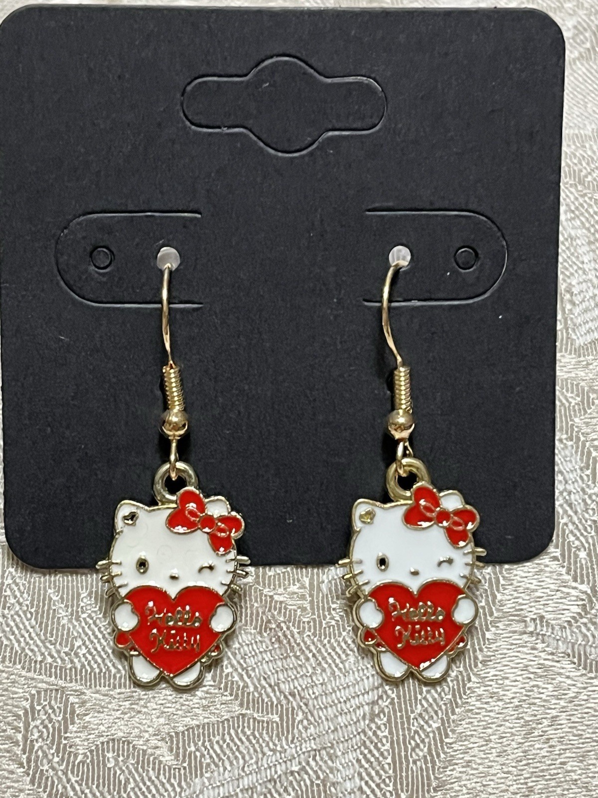 Hello Kitty Whimsical Heart Charm Gold Drop Dangle Adorable Fashion Earrings