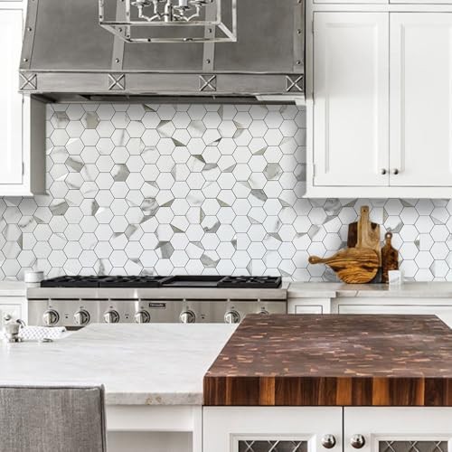 -Sheet Hexagon Tile Peel and Stick Backsplash, 10 Marble White Silver Studded