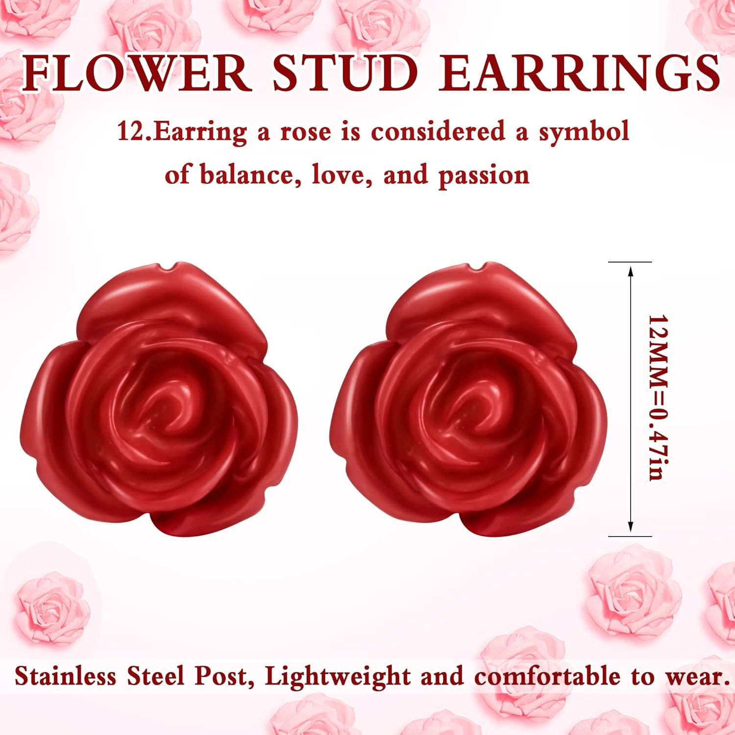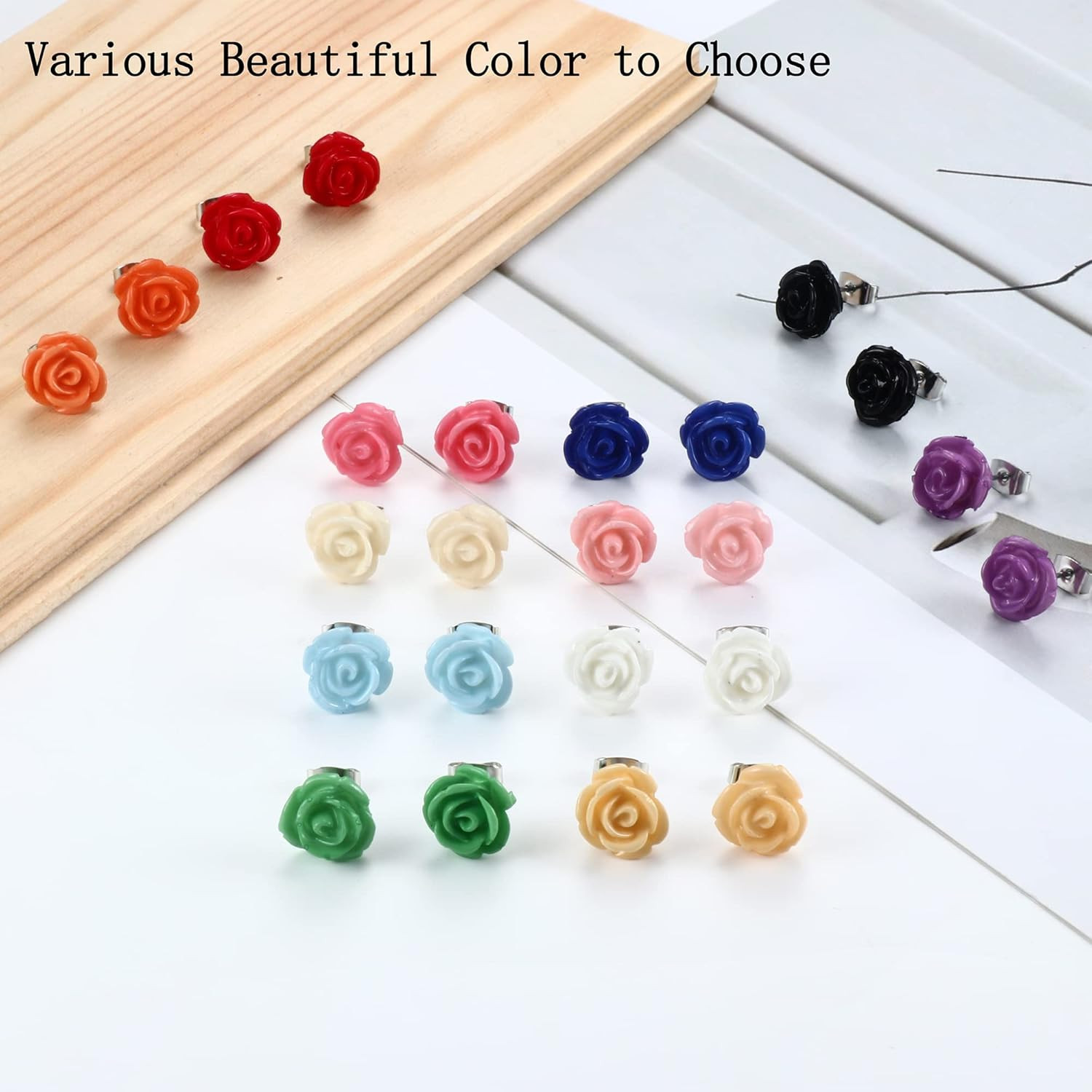 12 Pairs Assorted Colors Resin Rose Flower Earring Studs Set Stainless Steel Pos