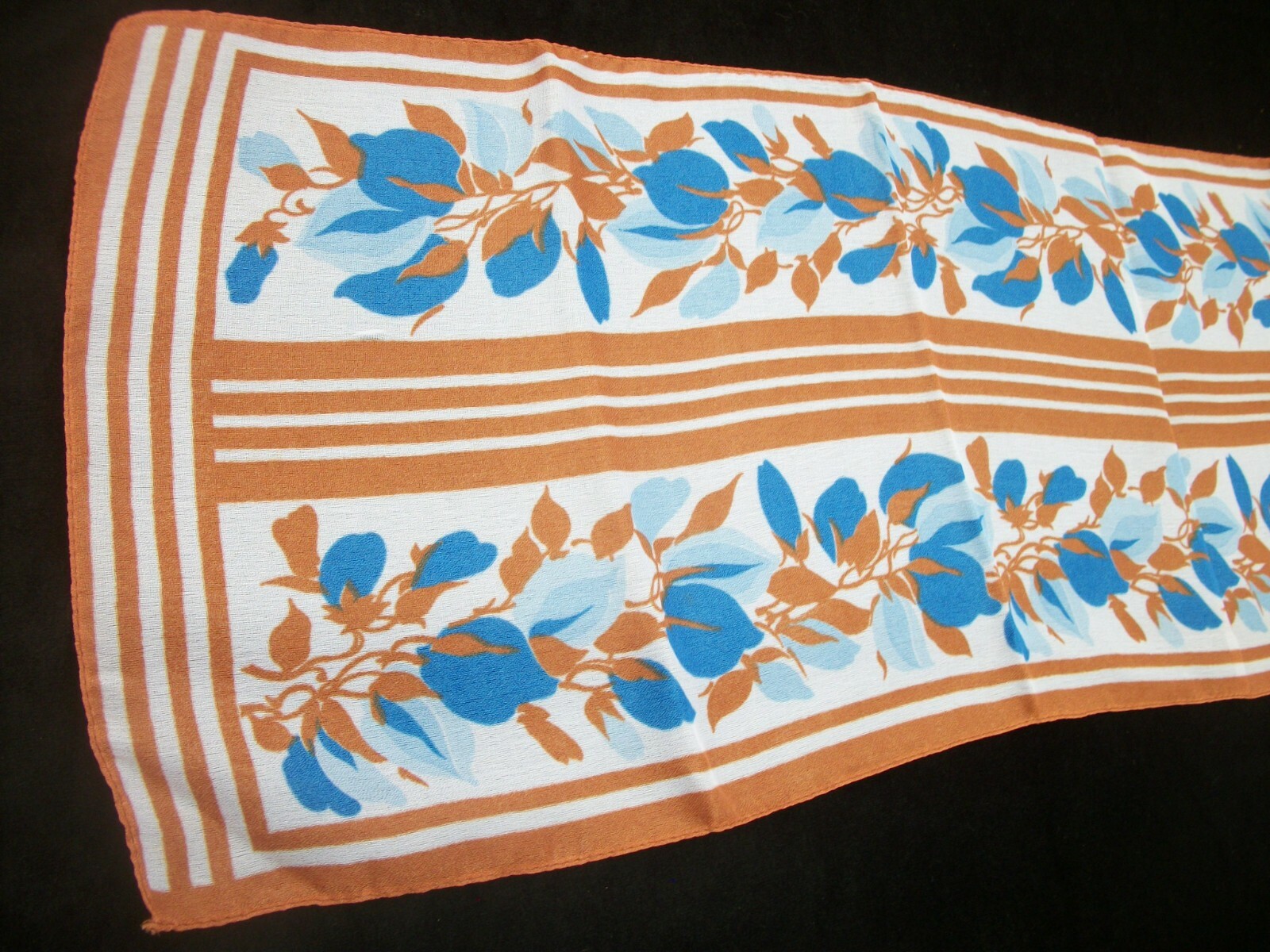 как выглядит Morsly Scarf Vintage Made in Italy Sheer White w Blue Leaves Brown Stripes SC98 фото