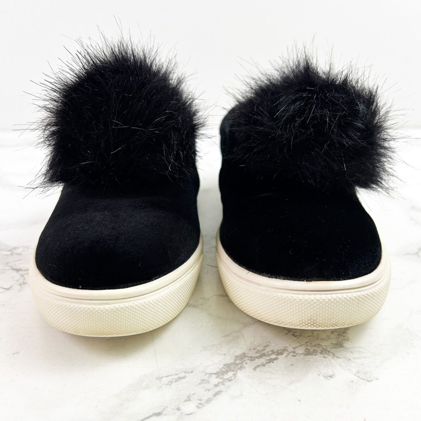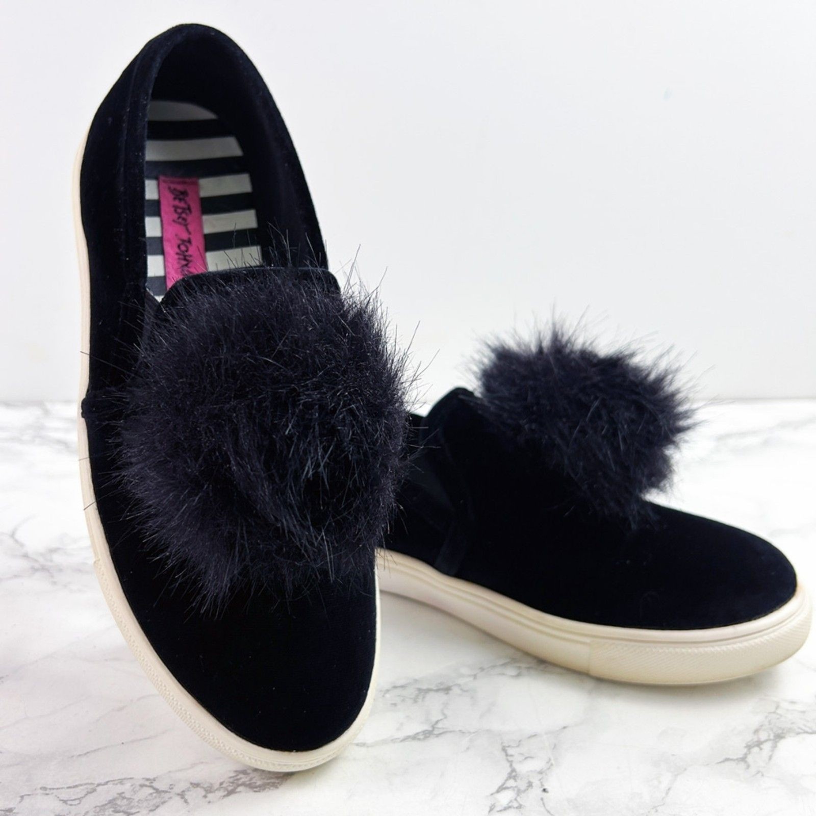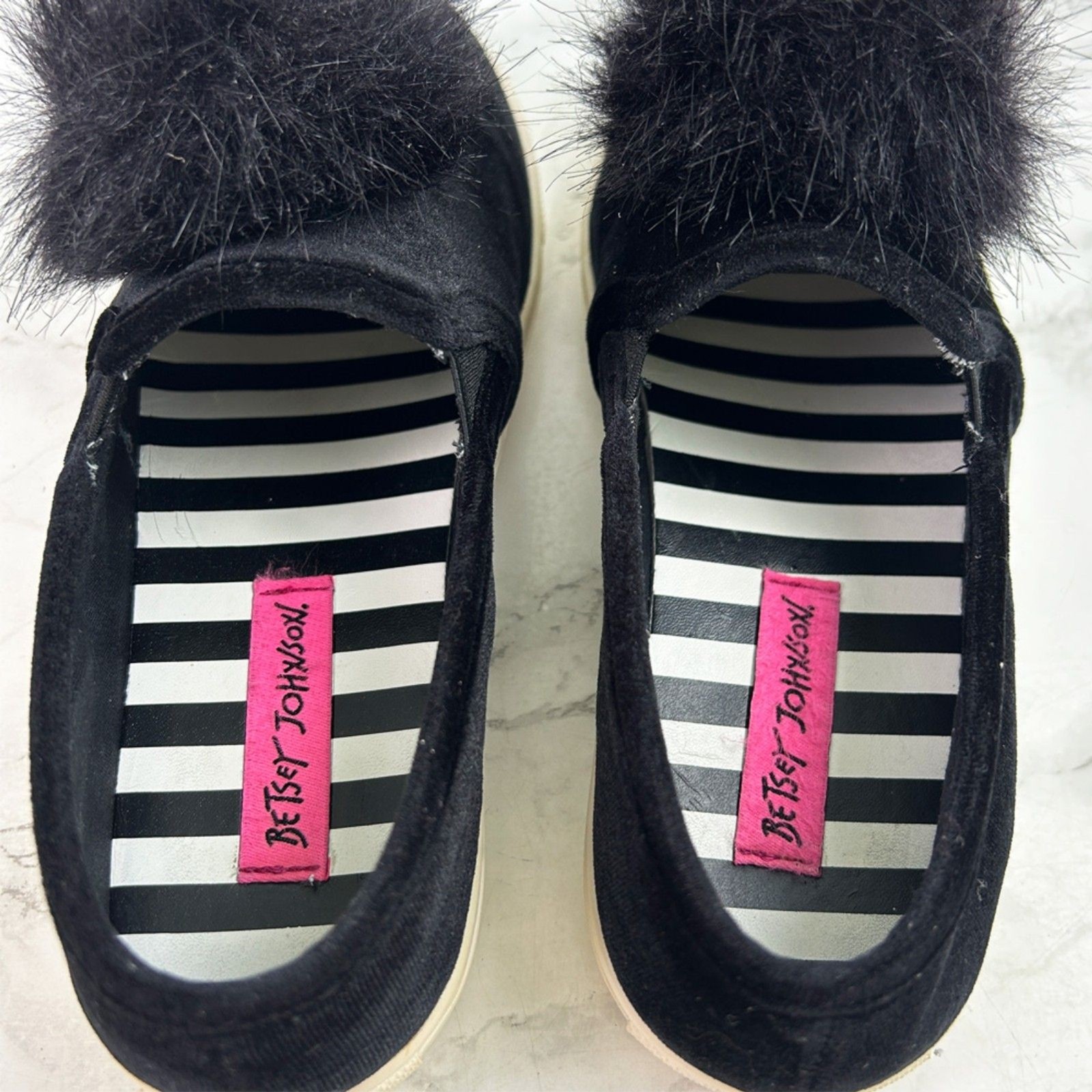 Betsey Johnson Zapp Royal Black Velvet and Pompom 6B Slip-On Flats Loafers