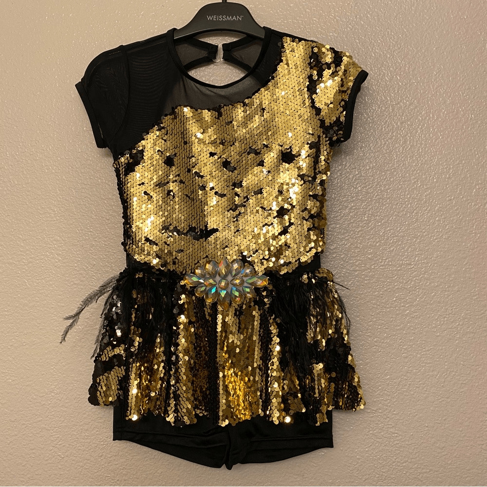 WEISSMAN Dance Costume sassy gold sequin feather Ruby Blue 13570 child MC 10/12