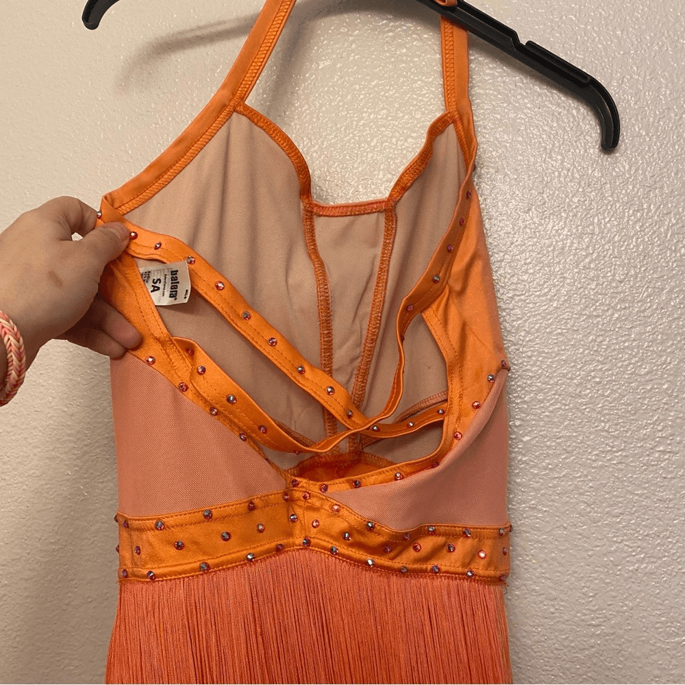 как выглядит Weissman solo dance costume orange LUSTRE FRINGE HALTER DRESS D11359 SA adult фото