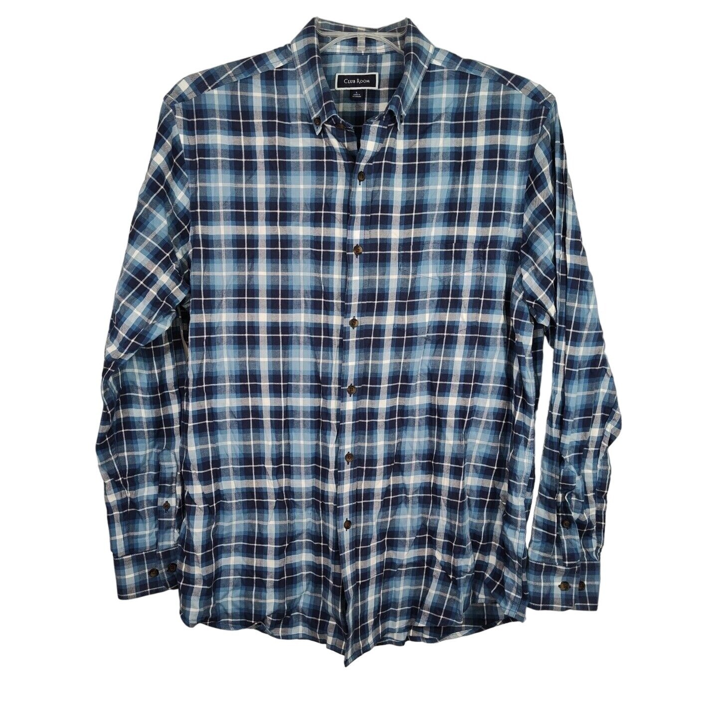 Club Room Plaid Blue Button Down Collared Shirt Men Size L Long Sleeve Cotton
