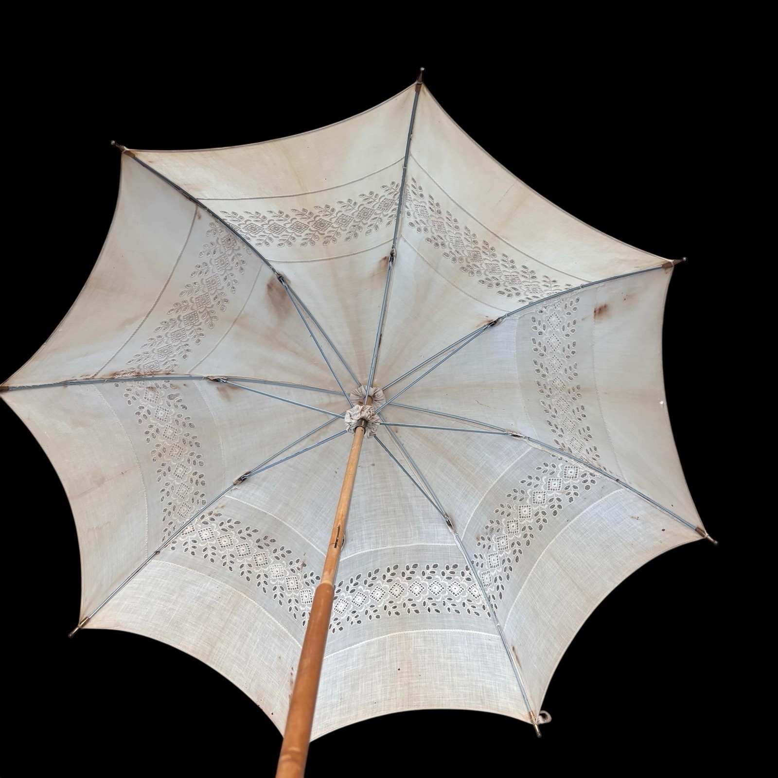Antique Victorian White Linen Cutwork Embroidery Lace Parasol Umbrella Bamboo