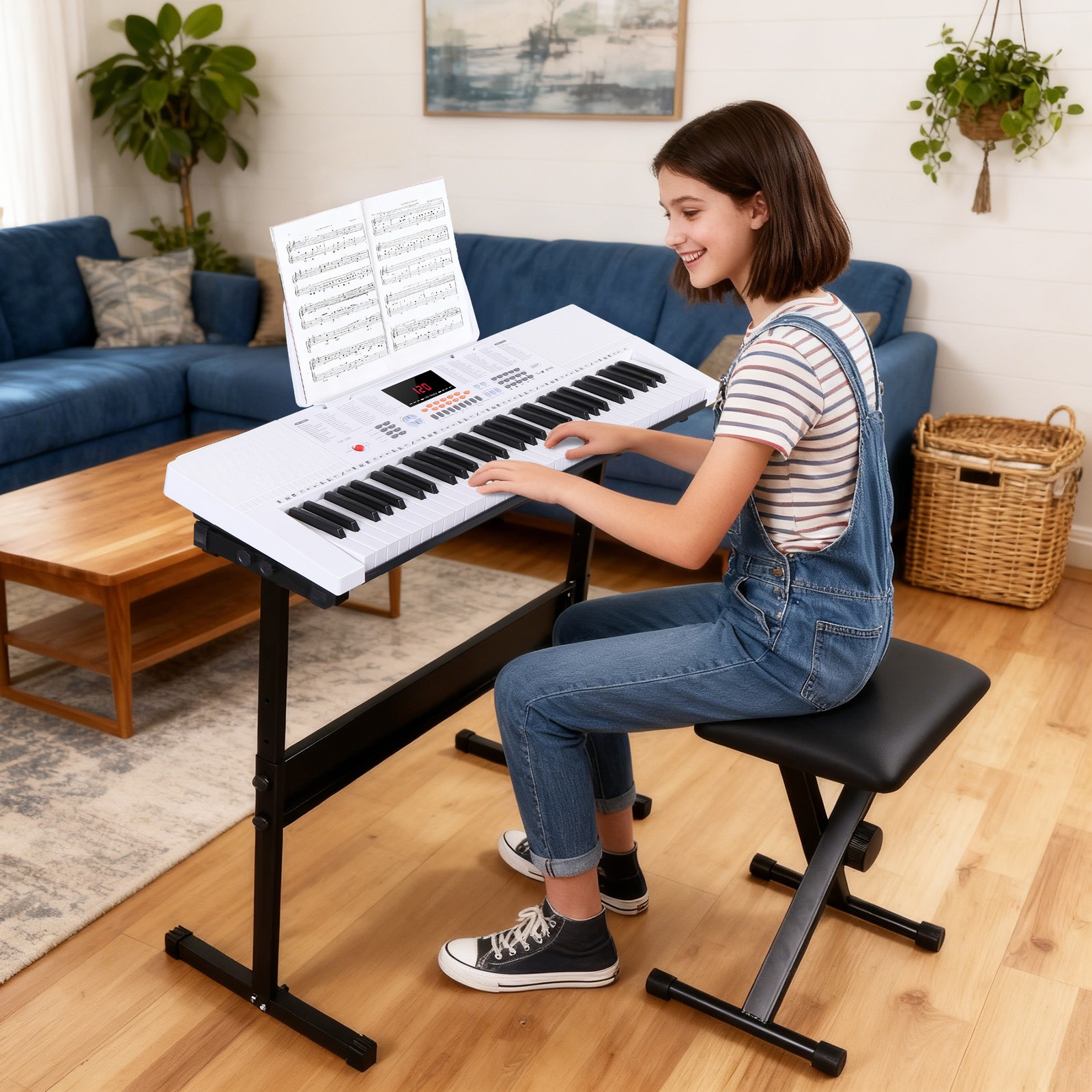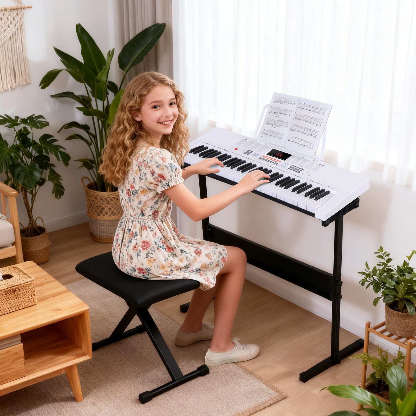Electric Keyboard Piano 61-Key w/Headphones,Microphone Stool for Starter White